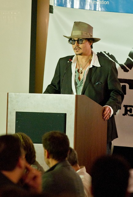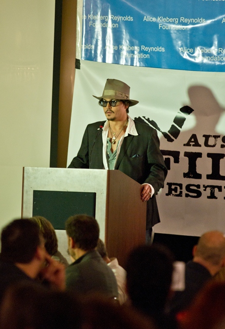 At the Austin Film Festival screening of The Rum Diary on Saturday. He also spoke at the Austin Film Festival Awards. I have to be honest, as much as it hurts to say, but... I’m not feeling it right now. He looks like sh-t. And I almost never think he looks like sh-t when he has short hair. So this post is brought to you by a lot of sadness. I feel like I’ve betrayed my country.