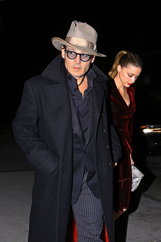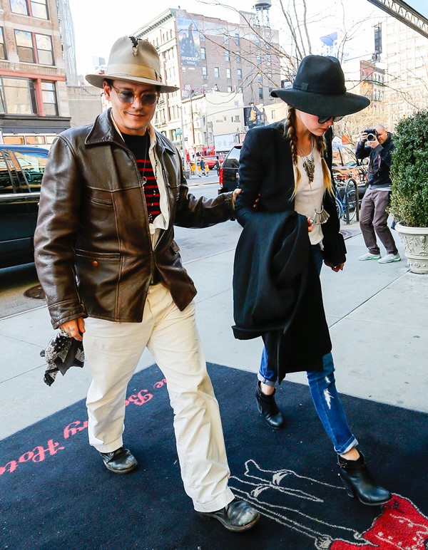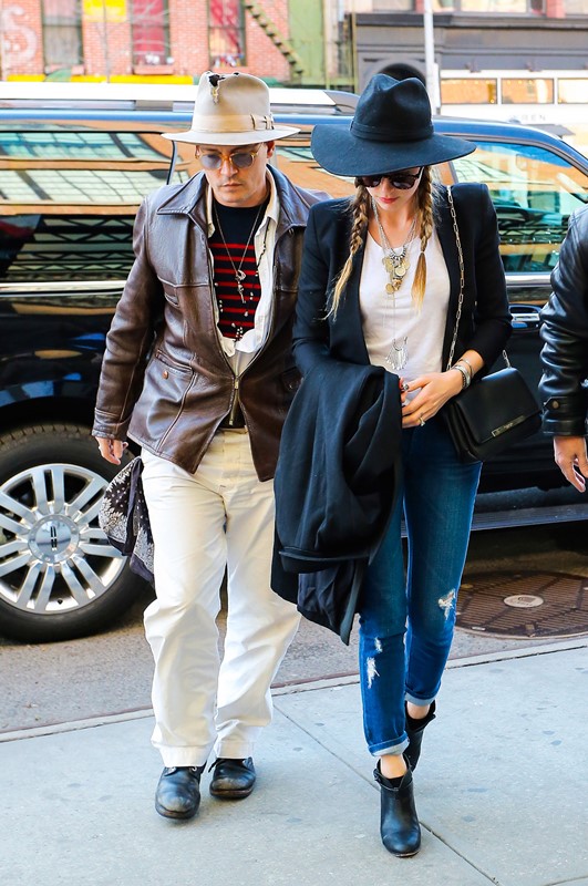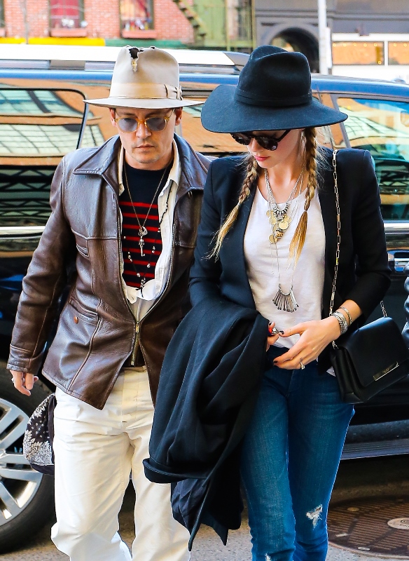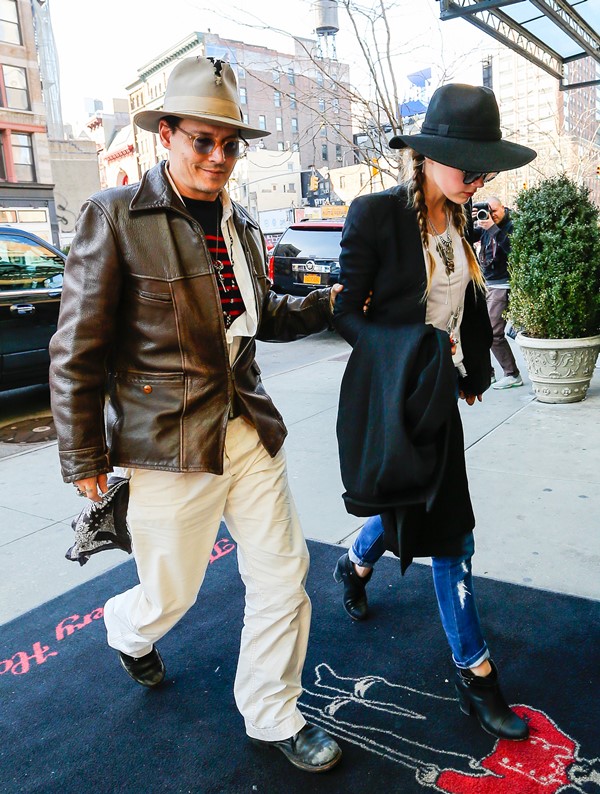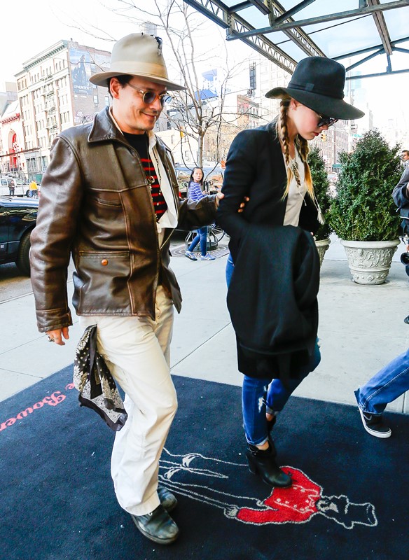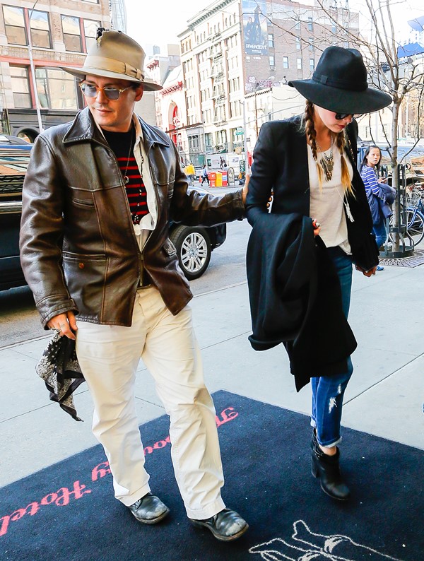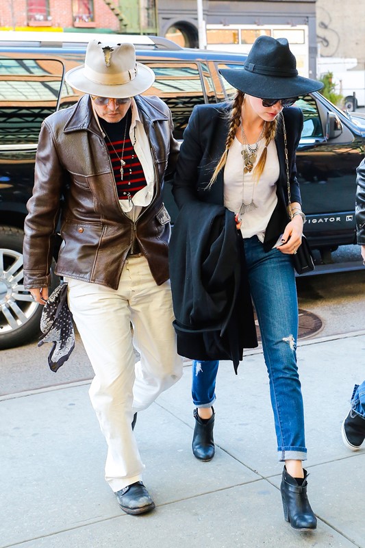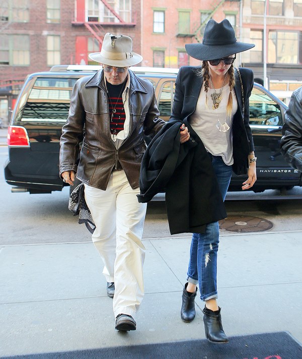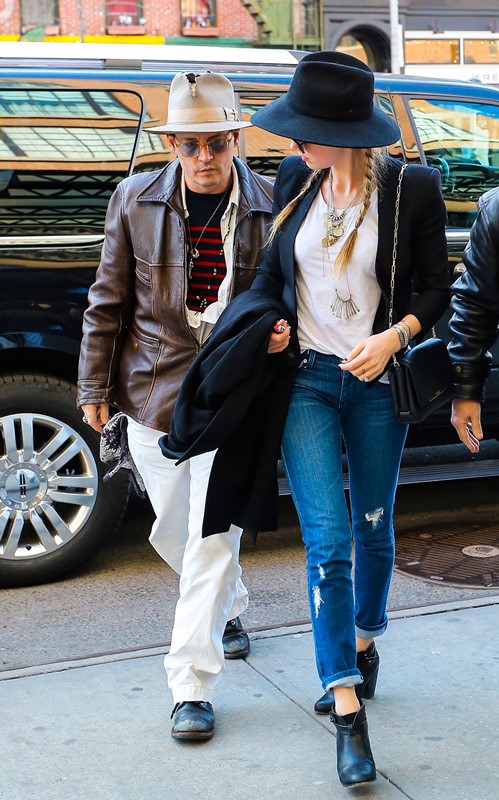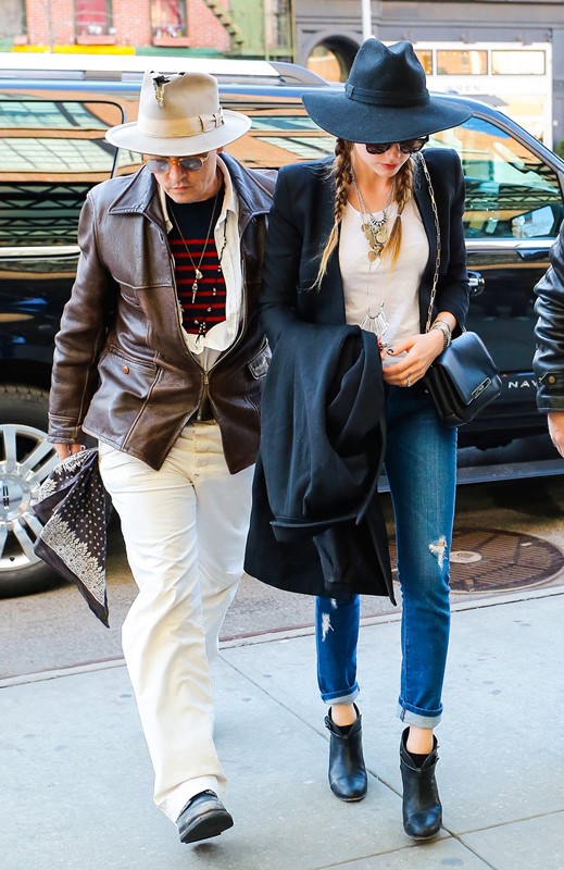 So it’s the future Mrs Depp’s birthday today. She’s now 28. And they were in New York last night to celebrate. Check them out arriving at the hotel with their hats on – his the ripped fedora, hers in black with a wider brim.