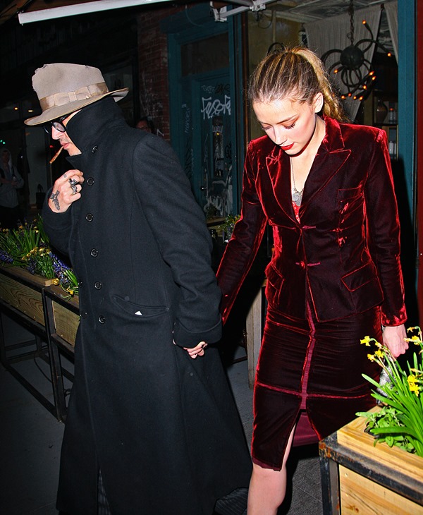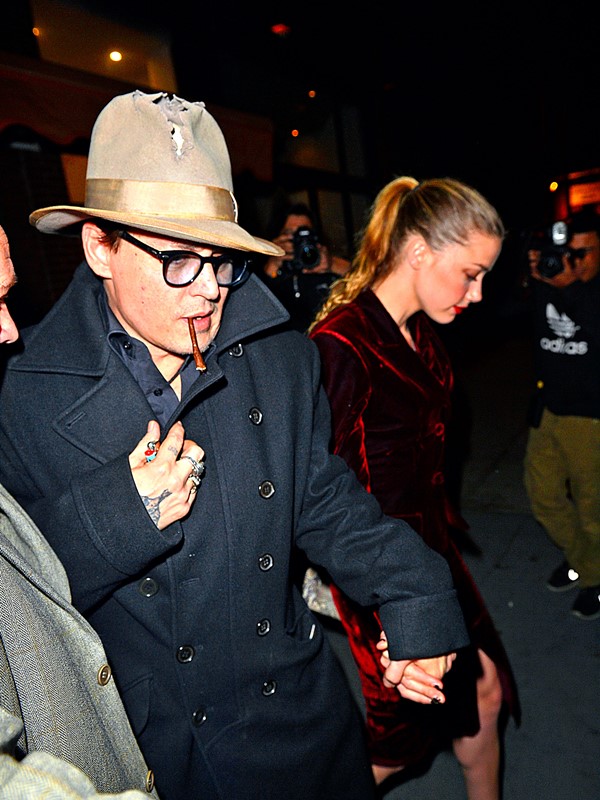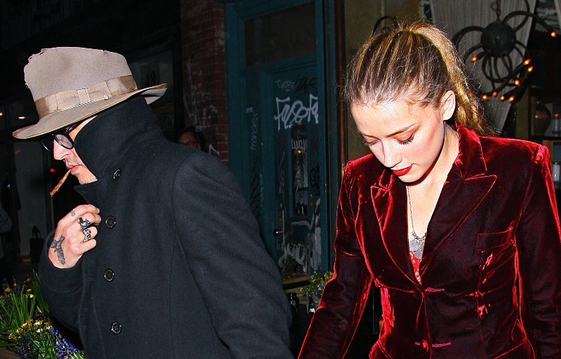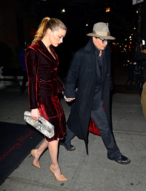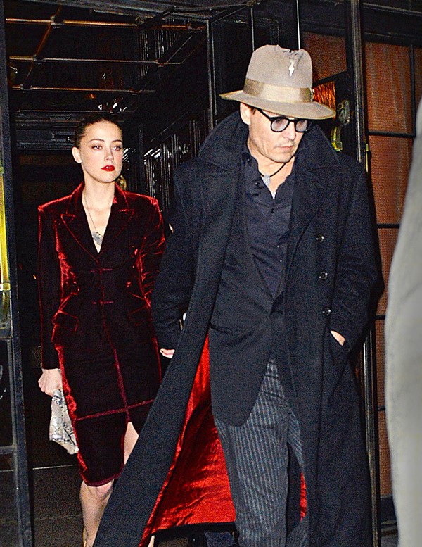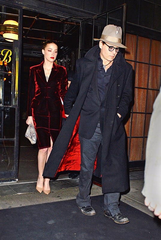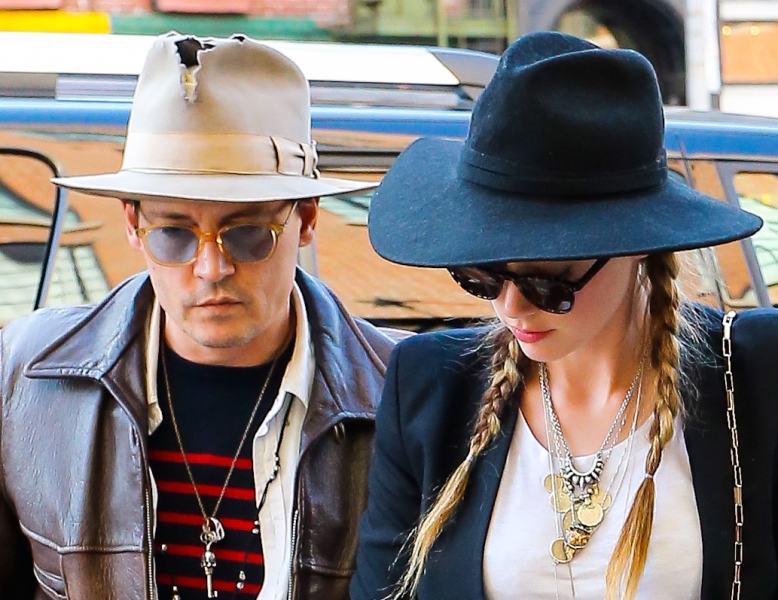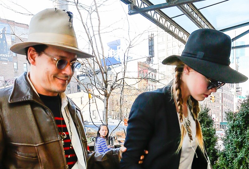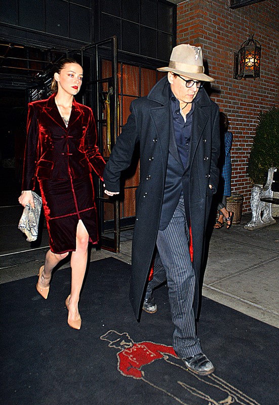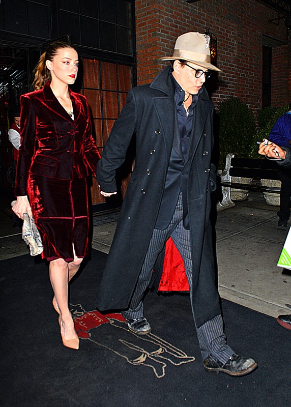 So it’s the future Mrs Depp’s birthday today. She’s now 28. And they were in New York last night to celebrate. Check them out arriving at the hotel with their hats on – his the ripped fedora, hers in black with a wider brim.