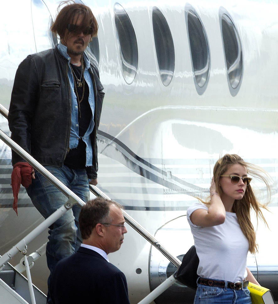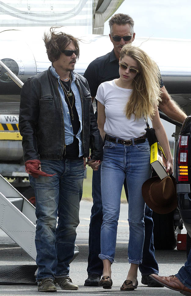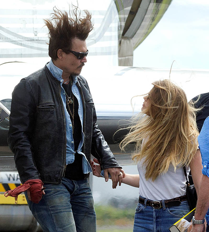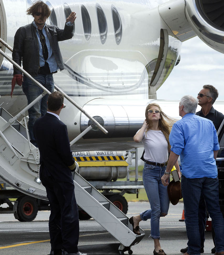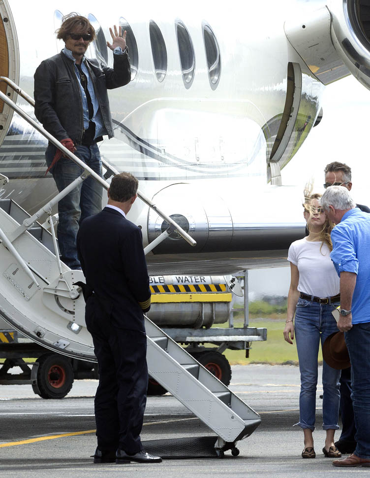After all kinds of speculation about where he’s been the last month (click here for my post from yesterday), Johnny Depp returned to Australia today on a private jet with Amber Heard. Photographers were there to document the arrival, which was more like a show. He’s waving to his public. They’re holding hands. She has a big smile on her face.