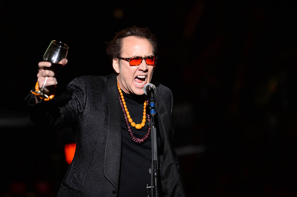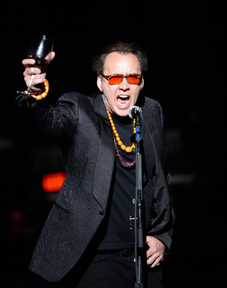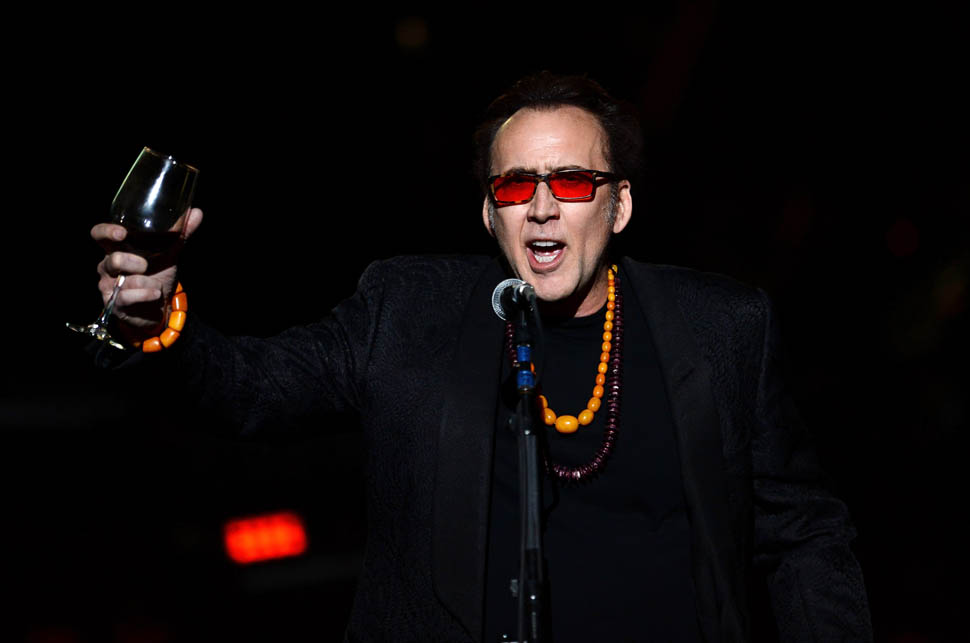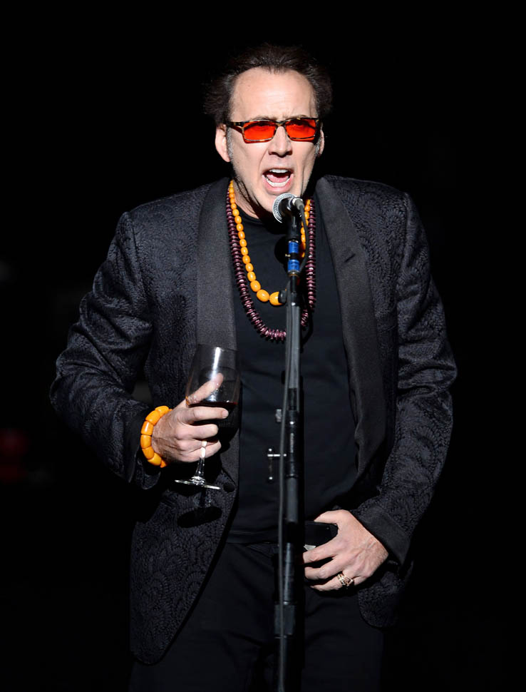 Please take a close look at Cage’s style – the hat, the beads around the neck, the t-shirt with his own face, that f-cked up belt, what appears to be fringe on his pants, the cane, the rings, waving around a glass of wine…