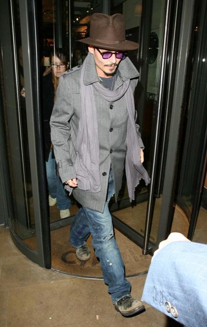 Johnny Depp in London after dinner with frequent co-collaborator Tim Burton and Helena Bonham Carter and also at the Sweeney Todd presser – pics from Deppendance – all smiles, playing with his hot lips, cute and sex at the same time in that hat…