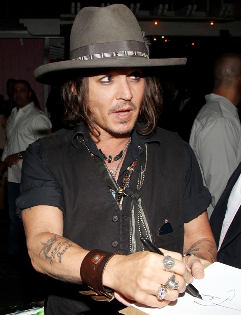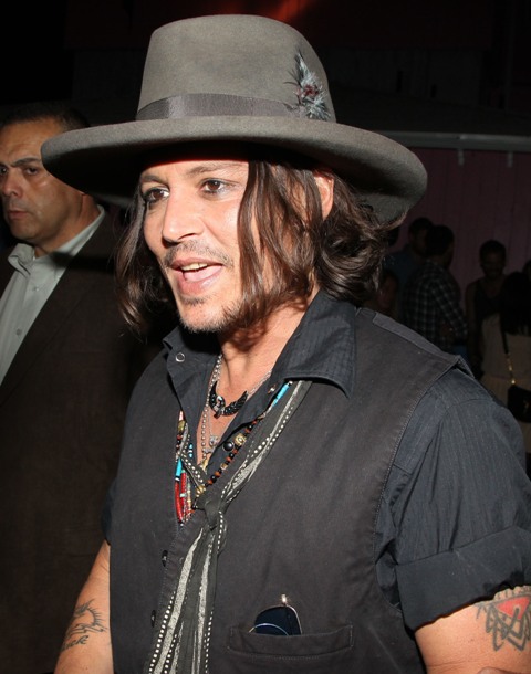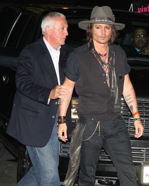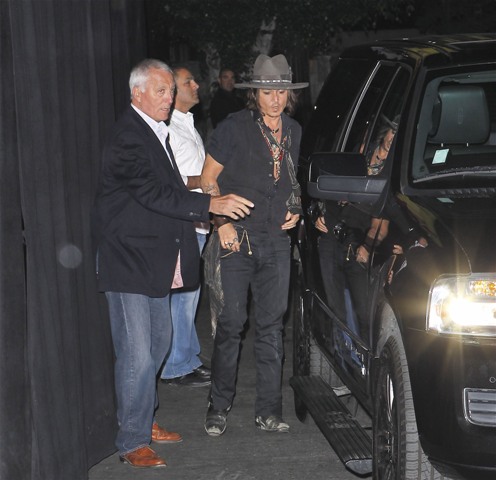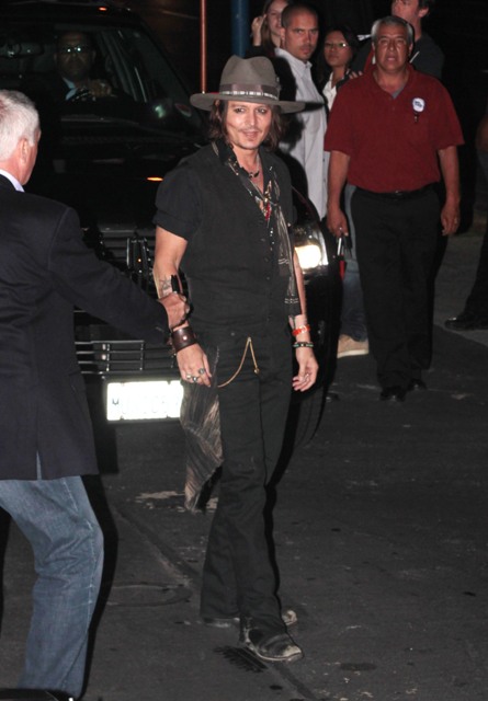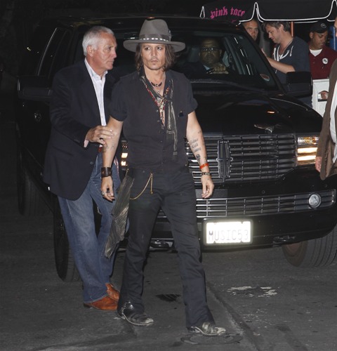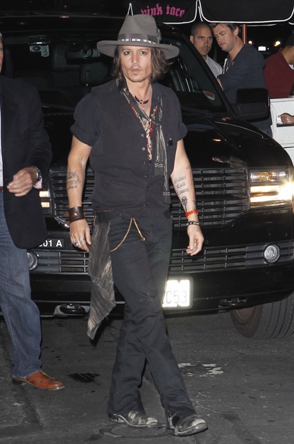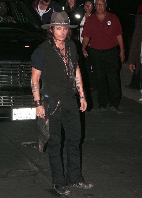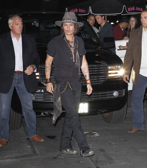 There was an Aerosmith show last night in LA. Here’s Johnny Depp showing up for Steven Tyler’s afterparty at Pink Taco. I guess that’s who he is now, a celebrity who goes to parties at Pink Taco. With 25 ropes and bands around his neck, several cuffs, bracelets, and rings on wrists and his hands, of course a wallet chain with a SCARF LOOPED INTO IT, oh and eyeliner too.