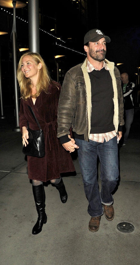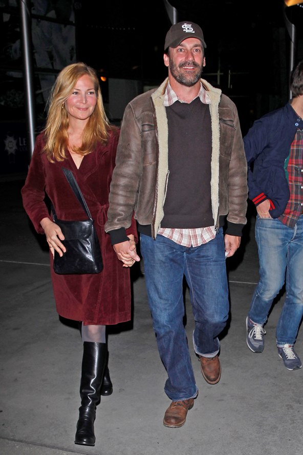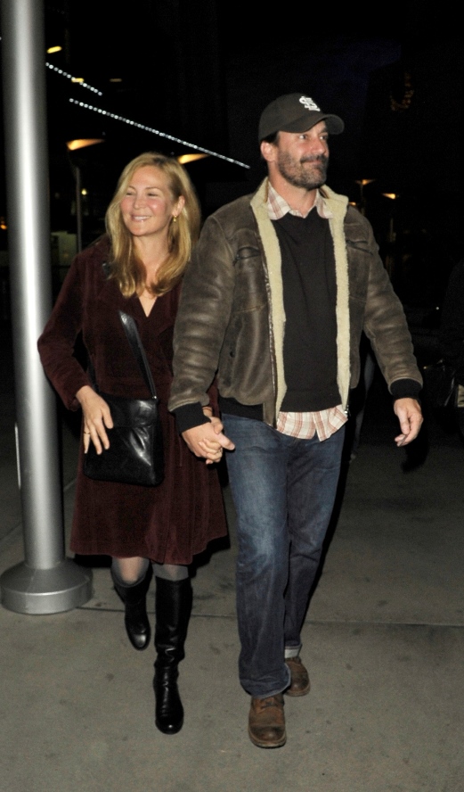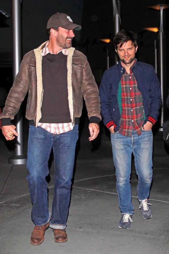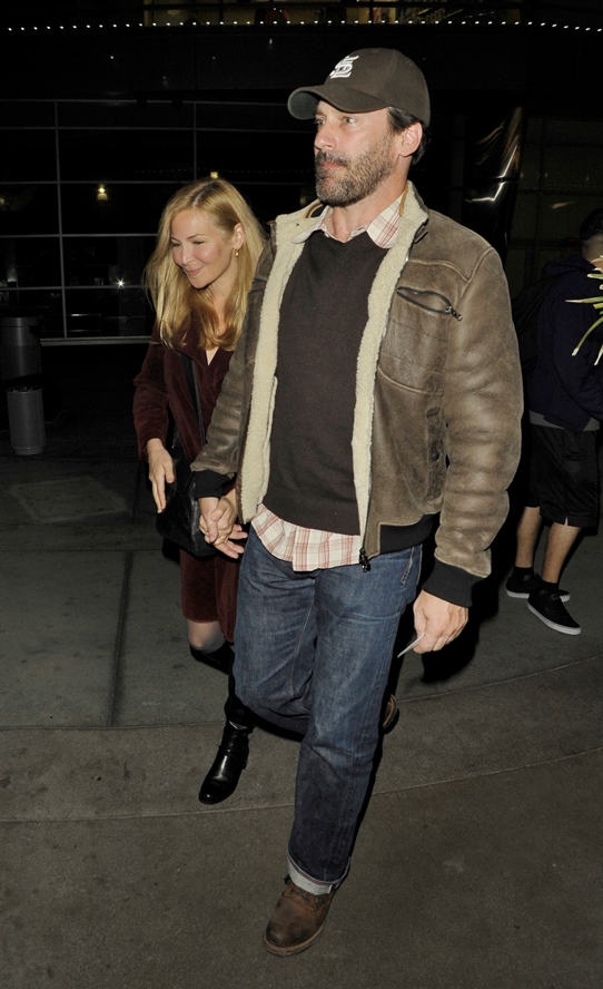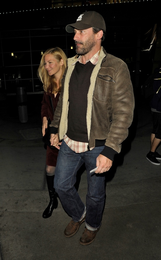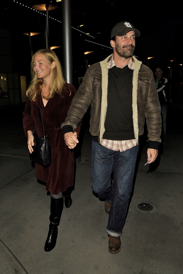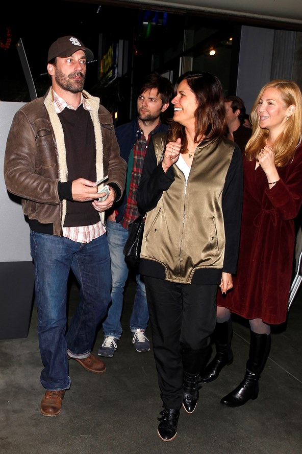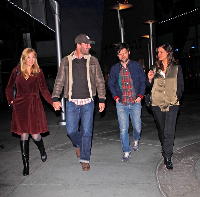 Jon Hamm and Adam Scott are doing like many of us are during the holidays – bingeing on movies! (Also, romance novels. Maybe that’s just me. But I’ve exhausted an entire year’s supply of YA love stories in 10 days.) Last night, Hamm and his girlfriend Jennifer Westfeldt were joined by Scott and his wife Naomi. They went to see The Wolf Of Wall Street. I have a lot of thoughts on The Wolf Of Wall Street. But we’ll get to that next week. Right now, I’m happy to report that the new year is not beginning with a Jon Hamm free-ball.