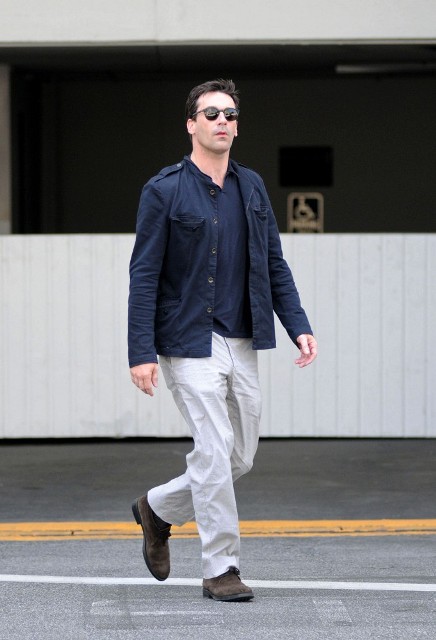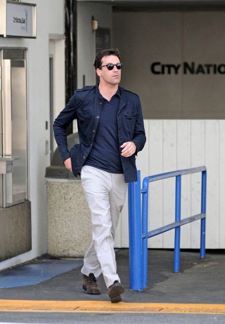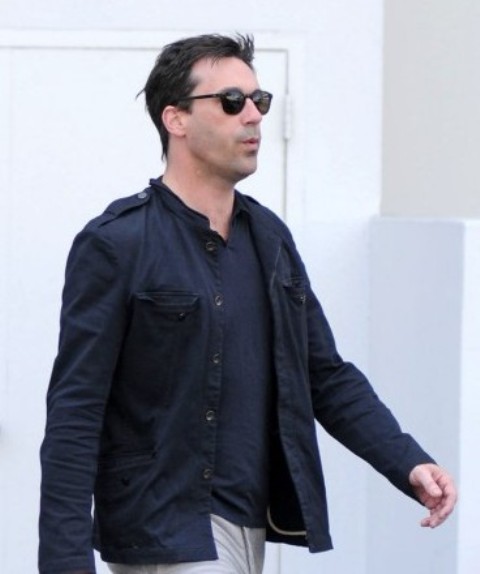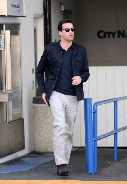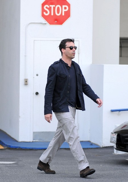 No idea why Jon Hamm is in such a great mood here, whistling in his sunglasses, looking SO handsome, but he was leaving the bank on Saturday so maybe he liked his bank balance? Jon gets paid less than that kid on Two and a Half Men, though, but you know he’s the kind of guy that’s just happy with what he has.
