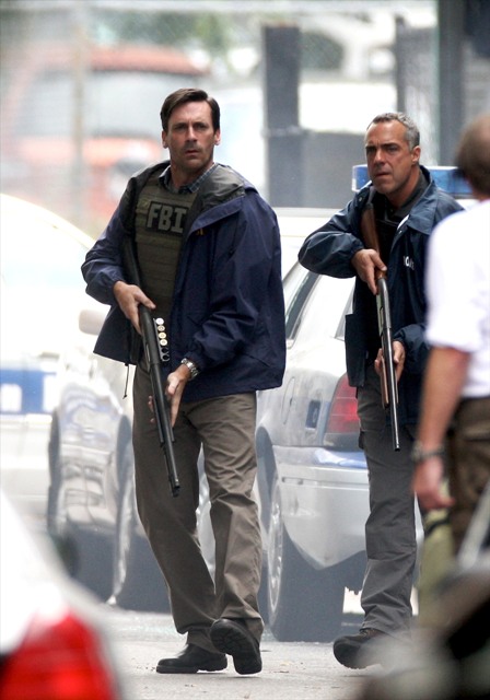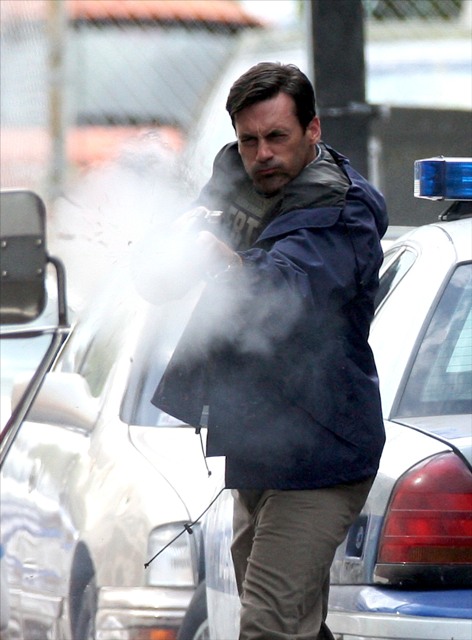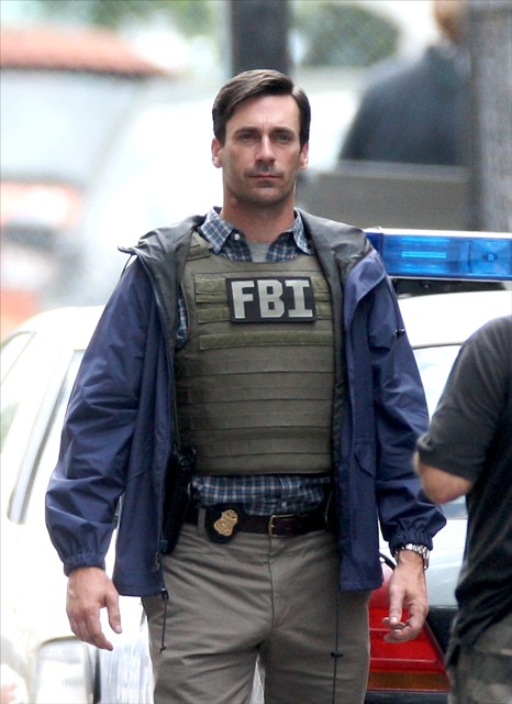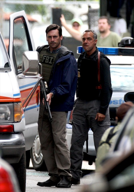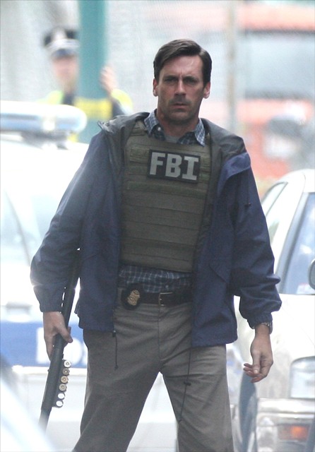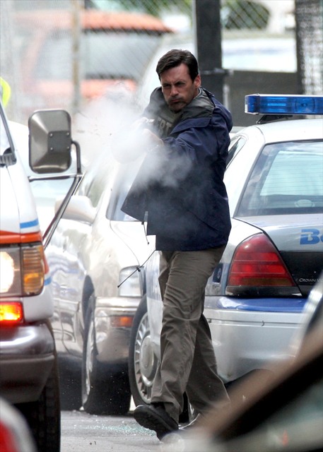 Jon Hamm in Boston on the set of The Town today, directed by Ben Affleck. After this he’s supposed to be en route for Vancouver to work on Sucker Punch.