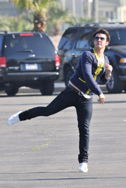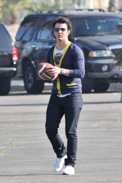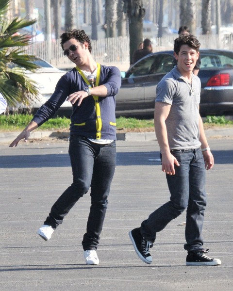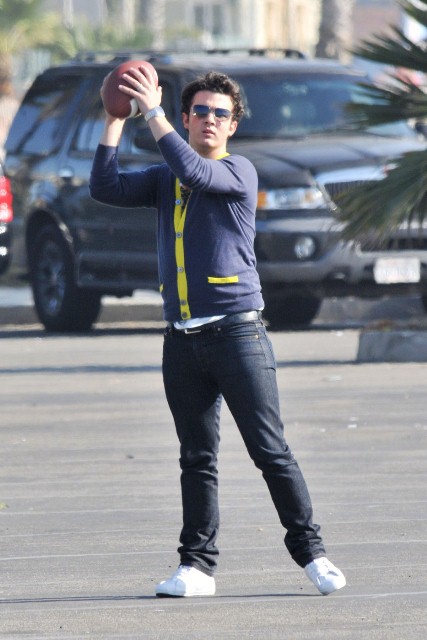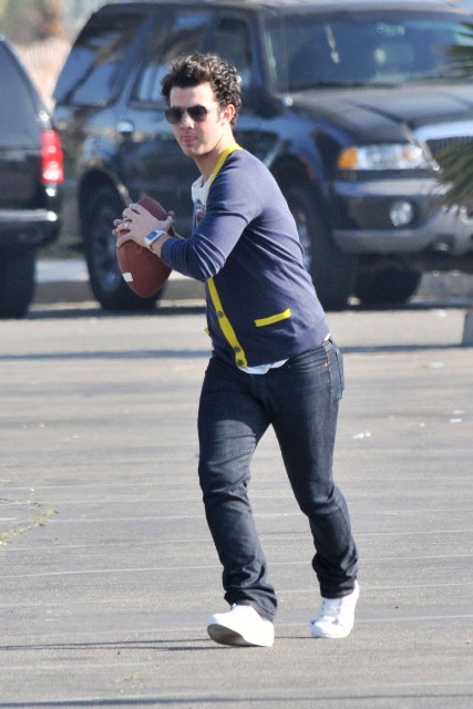 You can always count on the Jonas brothers for some photo gold, especially when it comes to their attempts at athleticism. I’m no gossip guru and probably have a pretty selective memory when it comes to most celebrity subjects, but it seems to me that 80% of the time the Jonas brothers are photographed they’re attempting to be athletic in some way. Luckily for us it’s always with many flavours of Jonas cheese. Case in point – Joe Jonas choosing to run through Yorkville during TIFF for privacy. Or this amazing set of the Jonas brothers throwing the pig skin around on set between shoots of Chasing the Butterflies.