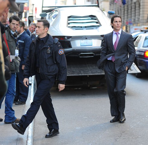 Joseph Gordon-Levitt and Christian Bale were in New York today shooting scenes for The Dark Knight Rises. Bale’s Bruce Wayne (as his tricked out car is getting towed) walks behind JGL’s John Blake, a cop, obviously, though internet fanboys still haven’t figured out if he’s a good guy or a corrupt police officer. Isn’t it amazing that Christopher Nolan can keep secrets? Or, more accurately, that his projects can be kept secretive? That somehow he’s able to seal the sh-t that needs to be sealed?