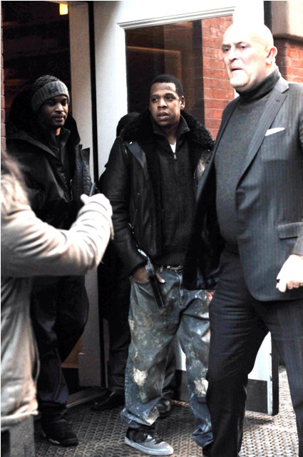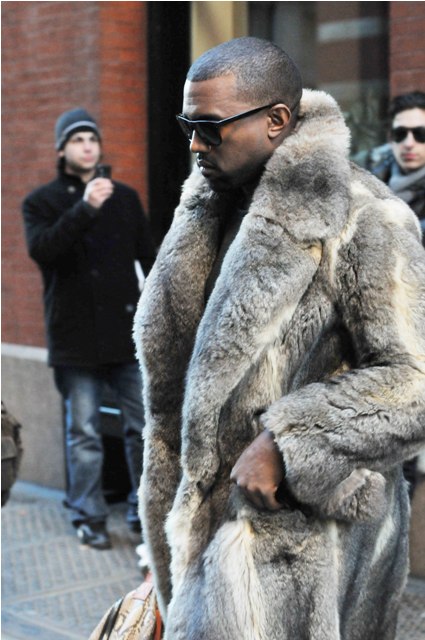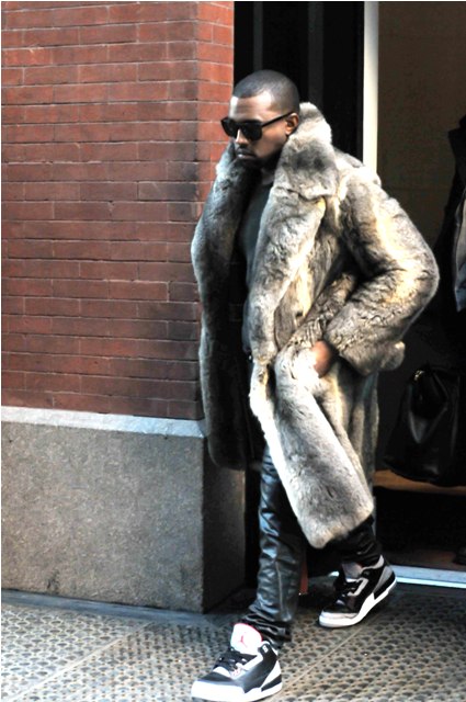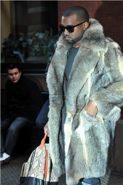 Kanye West hooked up with Jay-Z yesterday in New York for a meeting at the Mercer Hotel. As you can see, he was animal all over with an orange handle handbag and a fur coat to keep warm. Needless to say, Kanye being Kanye, there’s little chance of this being fake.
