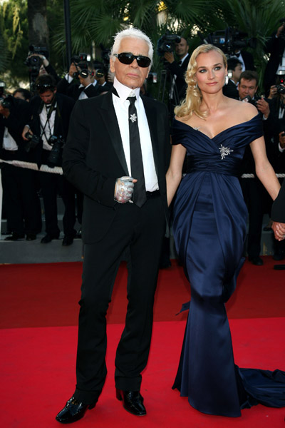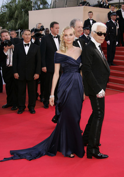 Have always found her pleasant to look at but highly underwhelming. Until now. Even last night as she arrived on the carpet for the Cannes closing ceremony flanked by Le Karl and Canadian Denys Arcand, who directed her in the festival’s final film L’Age des Tenebres - while her dress was spectacular, a perfect package from head to toe, the result was rather… bland. To be honest, I was more taken, as always, with Karl than I was with Diane. The man is endlessly fascinating, and she dared not leave his side even for one photo, held in place by the Kaiser grip of his fashionable fan-free hand, gloved in silver for the occasion and as intimidating as ever.