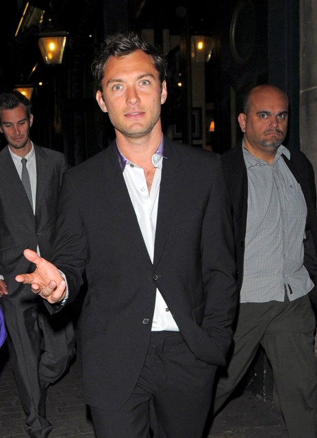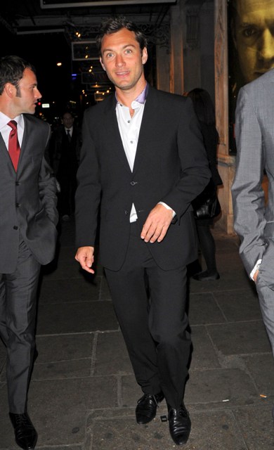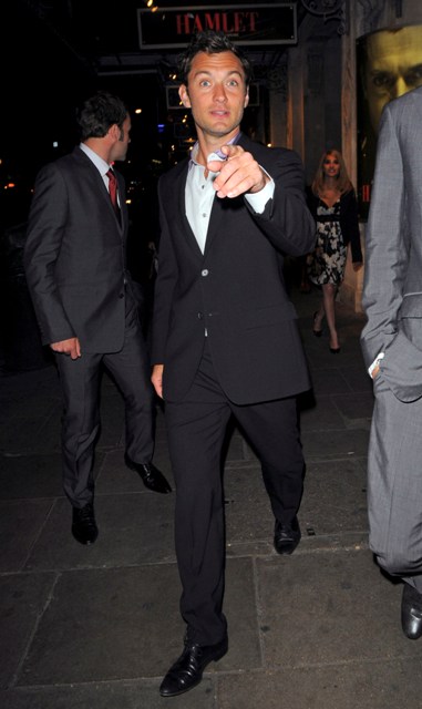 This is Jude last night in London leaving Wyndham’s Theatre where he is performing, to Emile’s artistic dismay, as Hamlet to wonderful reviews – click here for a taste. It’s a role that has reportedly revived him, reignited his creative fire, and perhaps for this reason, he’s looking better, healthier, more handsome than he has in a long time. Almost quiver worthy, non?