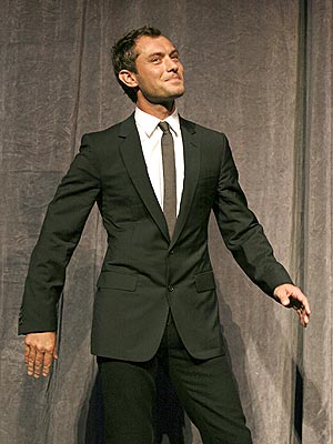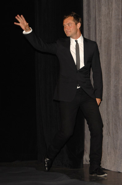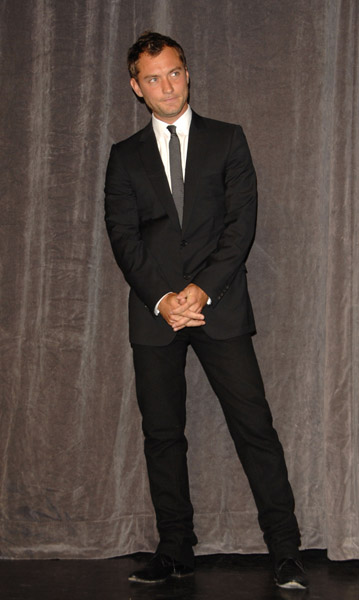 Jude Law last night at the TIFF premiere of Sleuth. Dapper dandy was surprisingly in fine spirits considering the little pap incident he had last week. Stopped to talk to everyone, even a little flirty at times, and trademark Jude style – skinny tie, skinny pants, very tan, and prettier than every woman in the theatre.