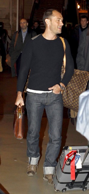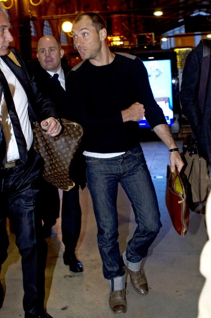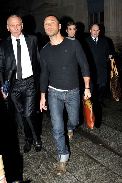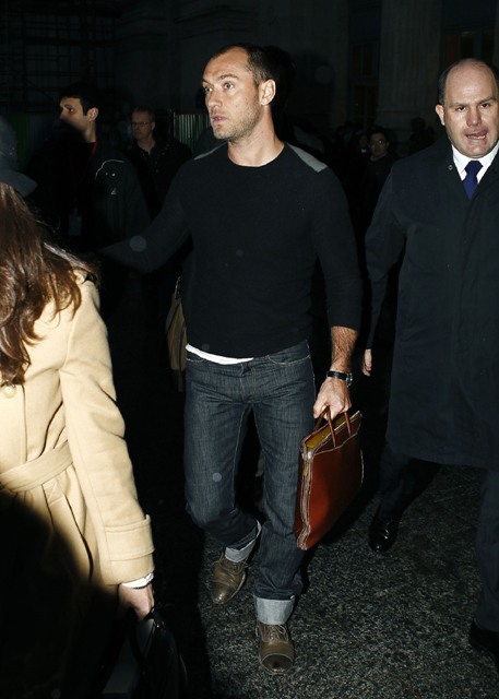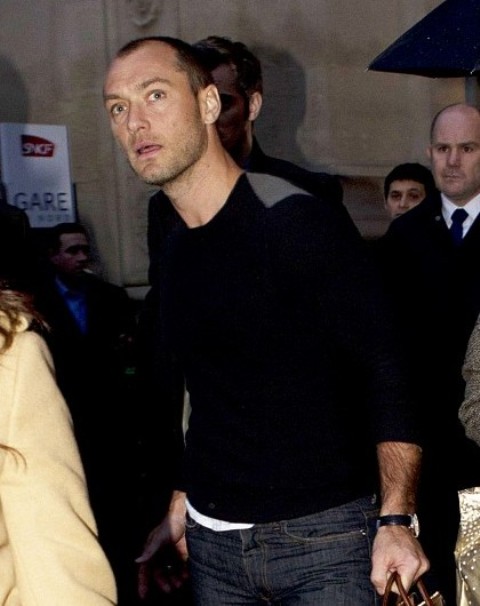 Jude Law was walking around in a hat for a while and said something offhand somewhere about a bad haircut and there arose some speculation that he’d had the plug. Or work. Whatever it is that can be done. As you can see in these recent shots, nothing has changed. Jude isn’t growing anything that wasn’t already growing.