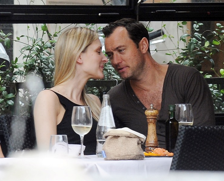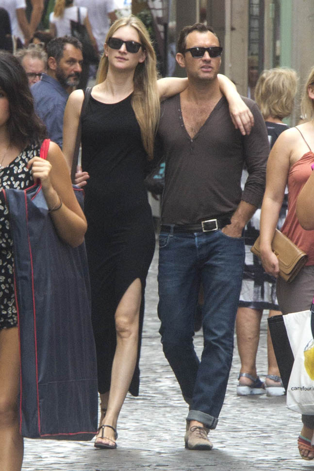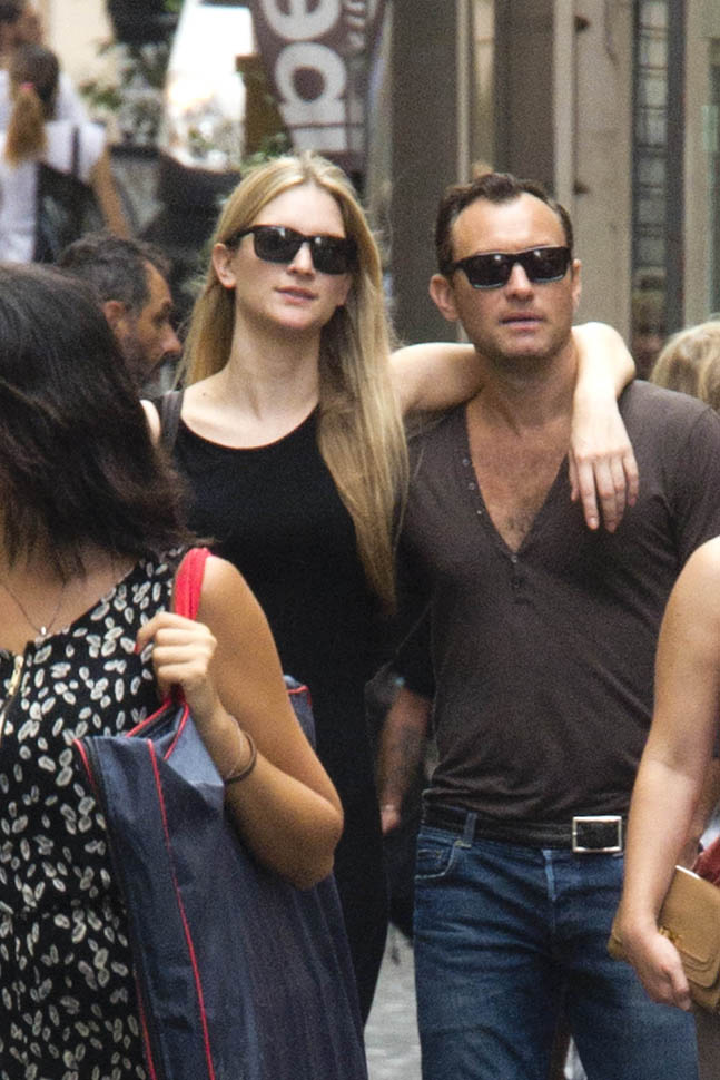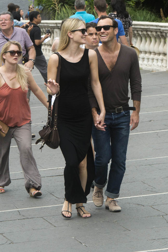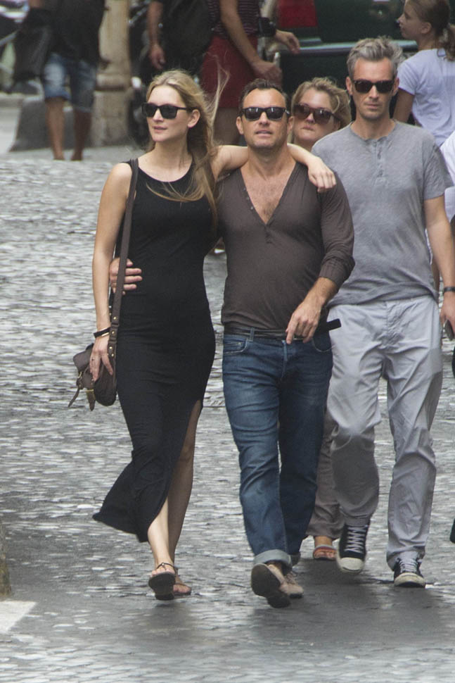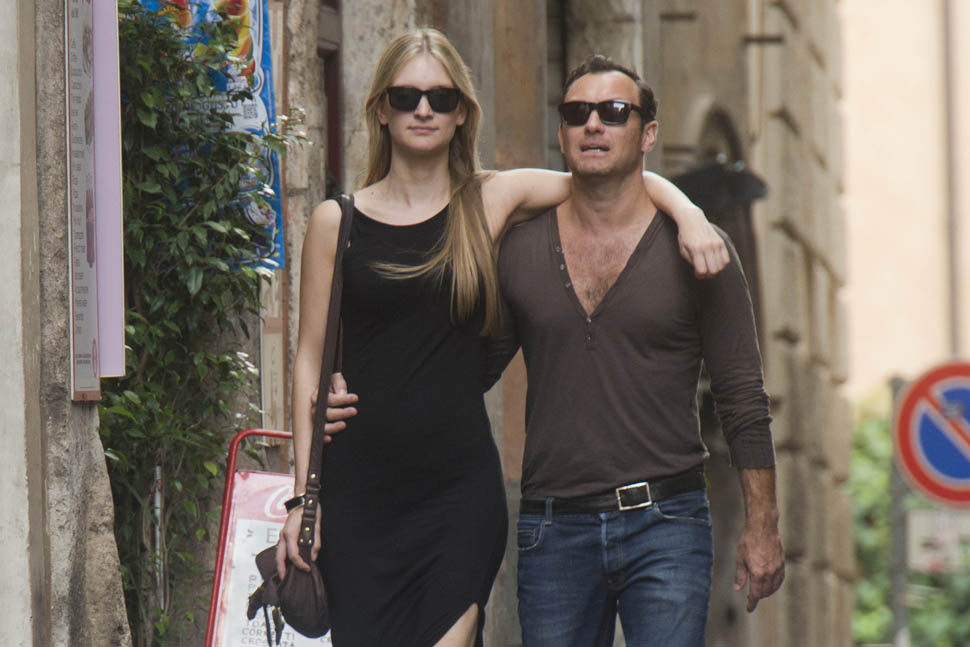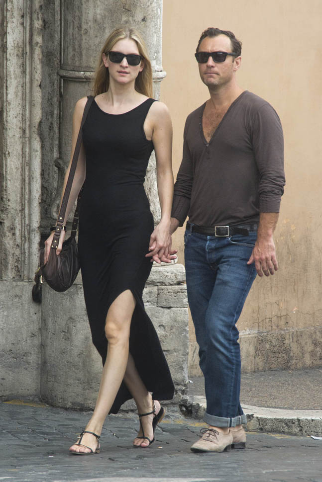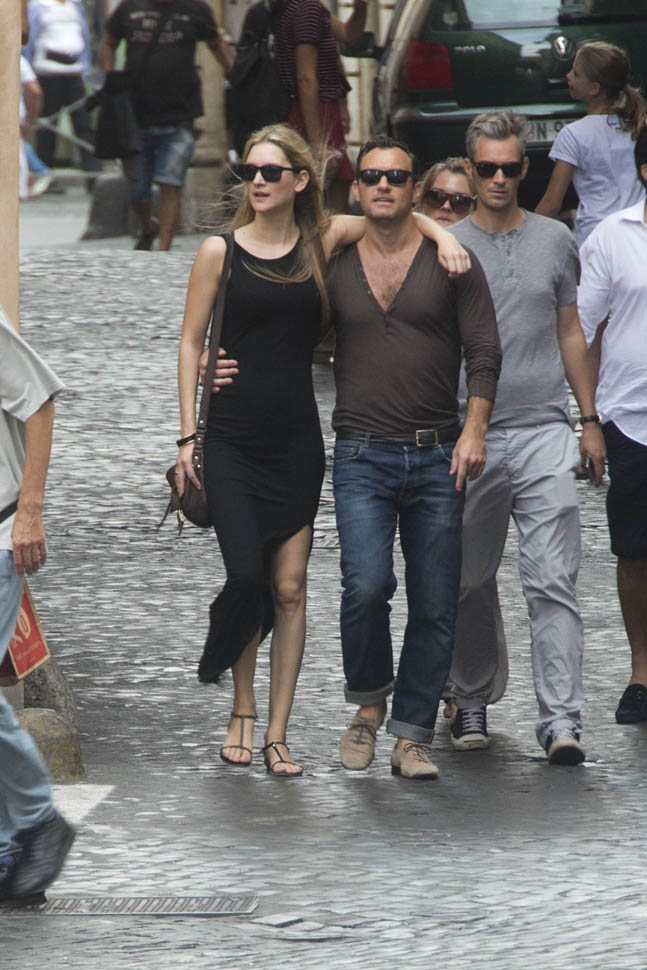 Jude Law’s been in Rome shooting The Young Pope. His girlfriend Phillipa Coan came to visit and the two were papped around town yesterday, holding hands, kissing, and showing off his deep V. As we know, as we’ve seen over the years, Jude loves his deep V. Jude’s achieved the highest concentration of deep V, a deep V master artist. Like he’s probably tried the V Vault and has secretly invented a level of deep V that most of us can’t even imagine: