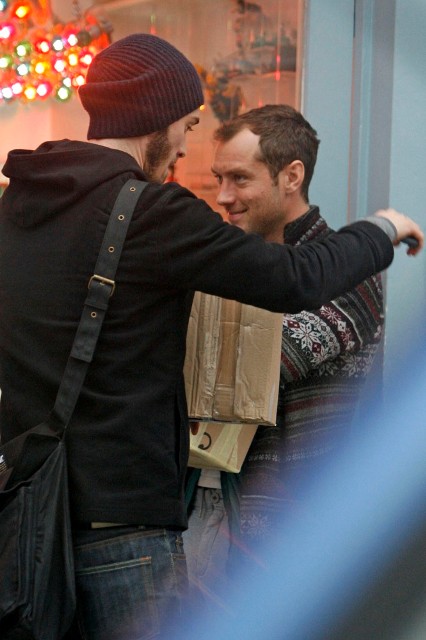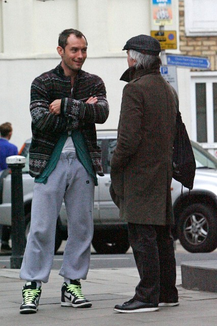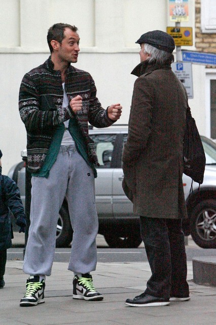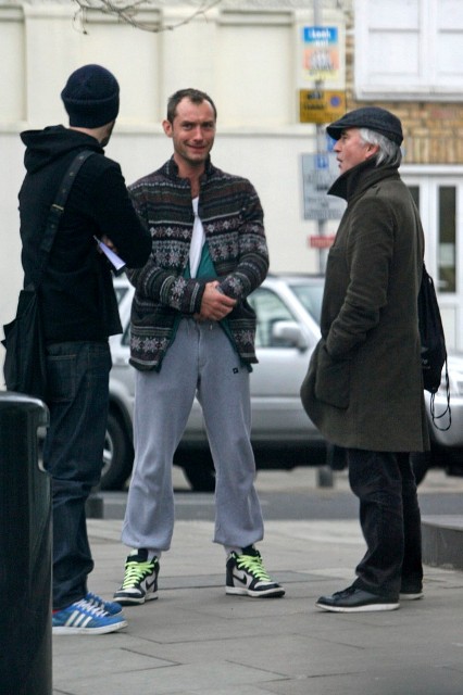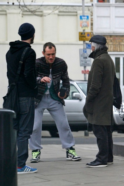 Jude Law was photographed in London today, chatting with a friend on the sidewalk before running some errands with an assistant type.