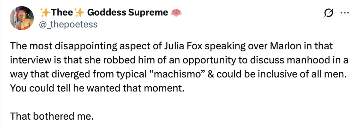 What Marlon might have said in that interview could have been life-changing for families who find themselves unsure of how to navigate or support having a trans family member. It could have been life-changing for trans people not feeling seen or heard by their family. And even if what he had to say only worked to reaffirm his support for his own son, his words, his thoughts, his views on masculinity matter, and he should have been able to express them. If only he had been given the time.