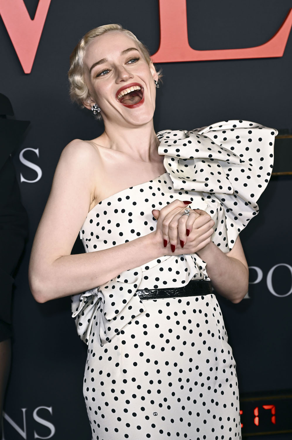 Julia showed up for the premiere in polka dots, which are, apparently, very on trend this summer. I can’t do polka dots, even though I think they’re either very cute or a fun splash on a more sophisticated look, depending on how you style them, because one time a friend was wearing a polka dot dress and a Mean Teen™️ said scathingly Disney dog ass looking skirt as we walked by and the burn was so severe I felt it secondhand. I will never not hear “Disney dog ass looking skirt” when I see polka dots, but I DO like this dress on Julia a lot. This is exactly what I mean by “sophisticated fun”.
