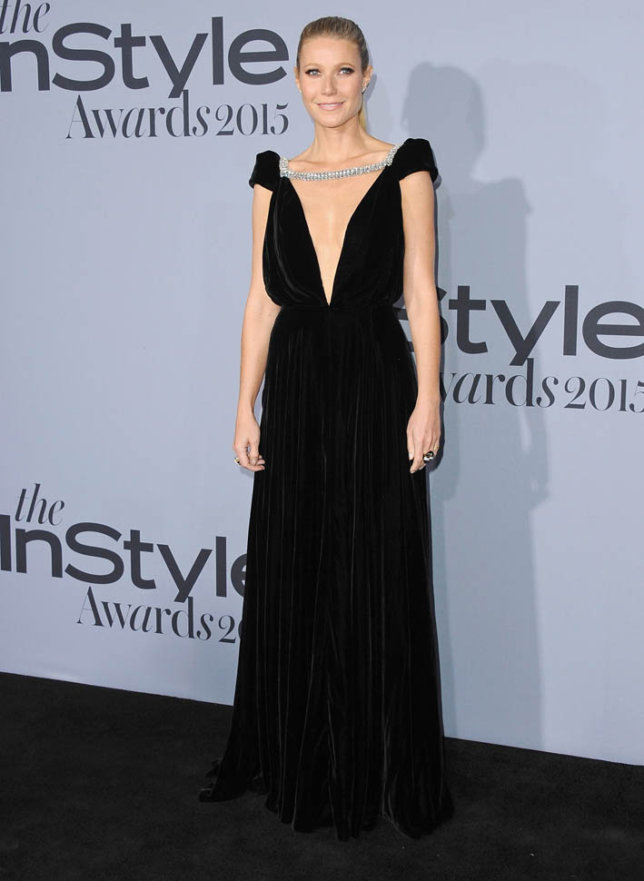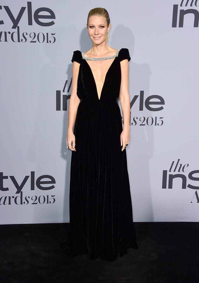 As for Gwyneth, get ready for it, she was named the Style Icon of the year, presented by Kate Hudson. G’s been winning a lot of awards lately. Variety gave her an award a couple of weeks ago (click here for a refresher) and the EMA gave her one this weekend (click here for a refresher) and now she’s an InStyle style icon, accepting in a gorgeous velvet deep cleave Schiaparelli cap sleeve backless gown that looks as good on her as it did on the runway. You know what’s tricky about this dress? Check it from the side, it’s bloused at the waist. And she still manages to make it work from every angle. Not sure about the black ribbon in her hair though. Seems kinda unnecessary.