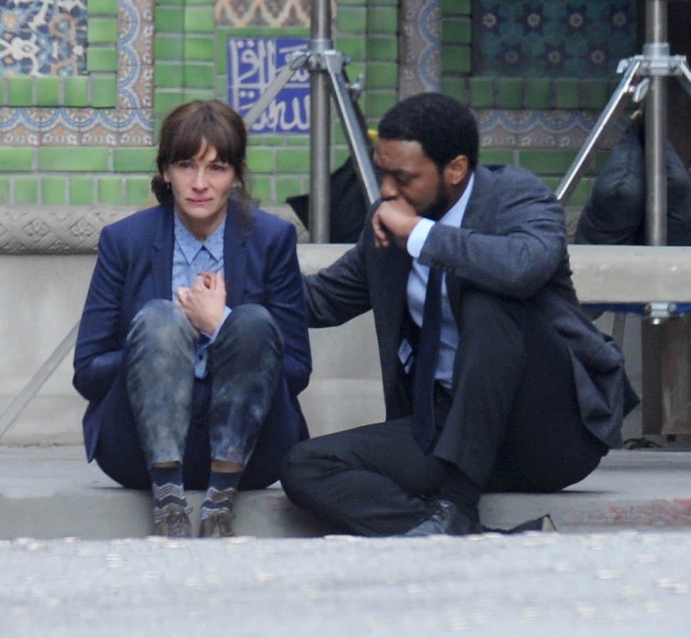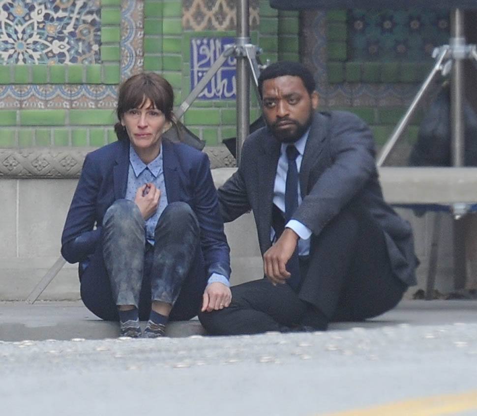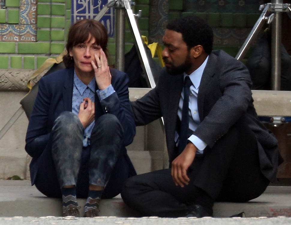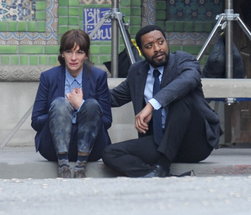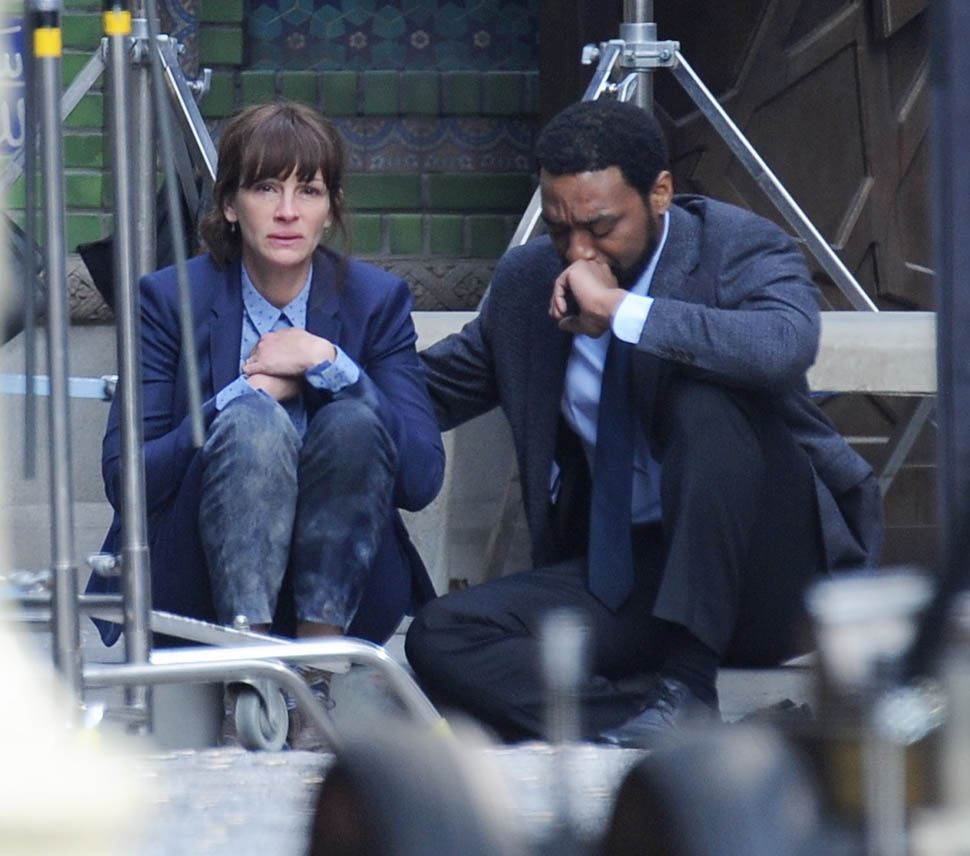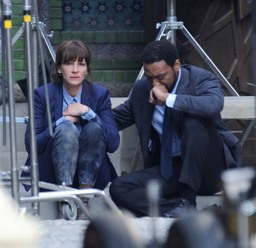 Julia Roberts and Chiwetel Ejiofor were papped while shooting an emotional scene from The Secret In Their Eyes yesterday in LA. At some point, her husband, Danny Moder, who is also working on the film, came over to give her some instruction, likely technical. Because she doesn’t need any tips on how to cry on camera.