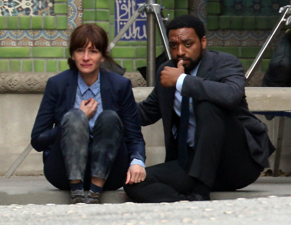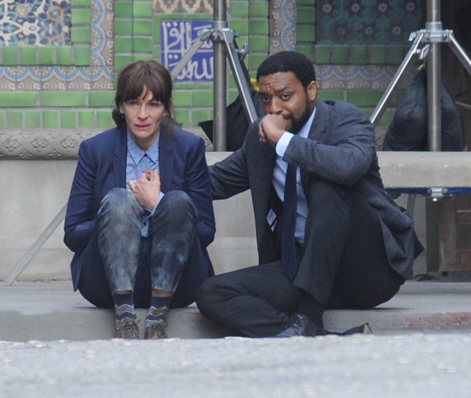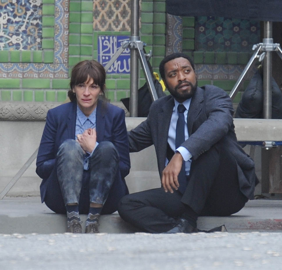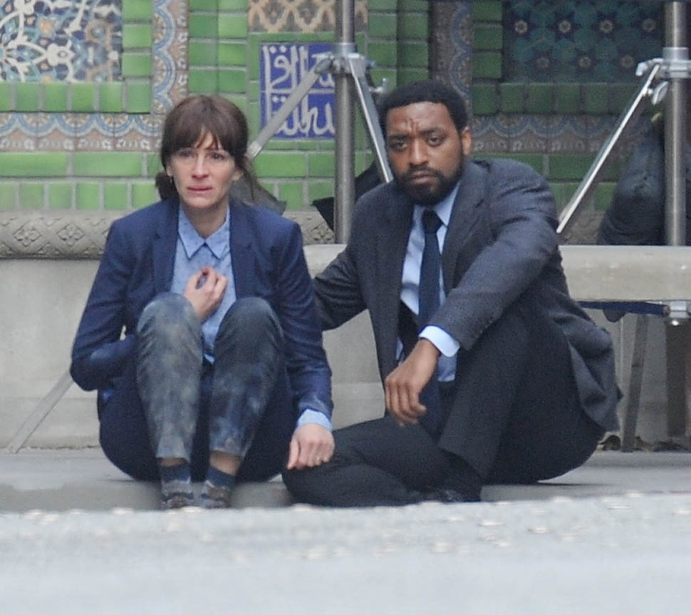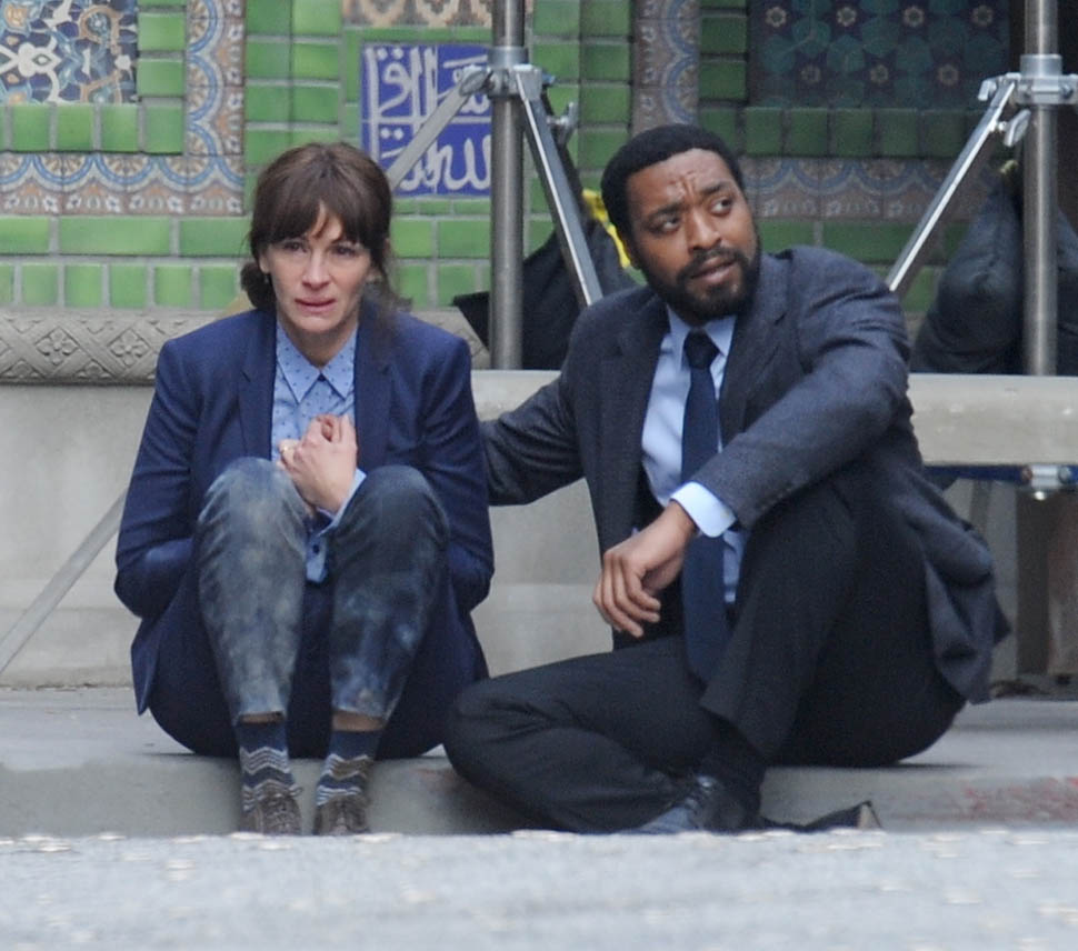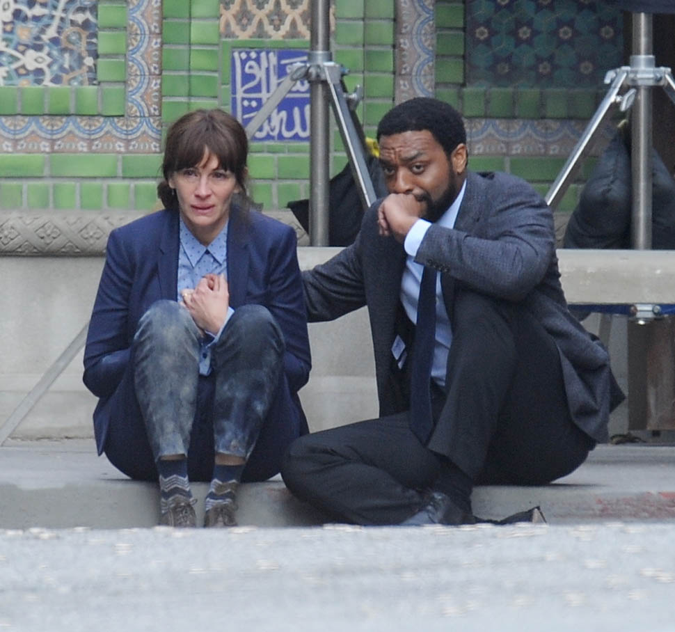 Julia Roberts and Chiwetel Ejiofor were papped while shooting an emotional scene from The Secret In Their Eyes yesterday in LA. At some point, her husband, Danny Moder, who is also working on the film, came over to give her some instruction, likely technical. Because she doesn’t need any tips on how to cry on camera.