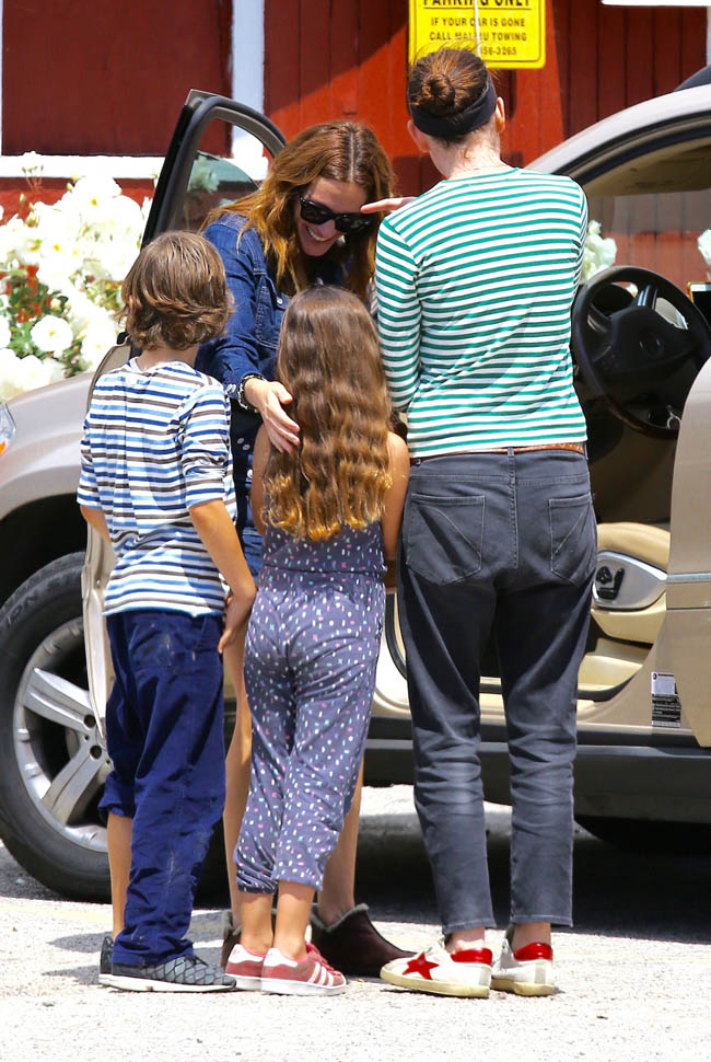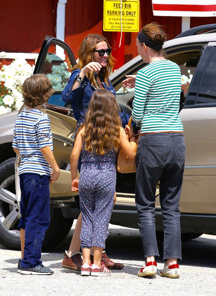 All three happened to be photographed this weekend. Jodie, George, and Julia met up in LA on Friday and Julia was with some friends on Sunday afternoon in Santa Monica in a denim romper. Before Cannes though, Julia has Mother’s Day, with Jennifer Aniston, directed by Garry Marshall, opening at the end of the month. That movie? Looks atrocious. Although the selling feature seems to be that Julia and Jen might be in a scene together?