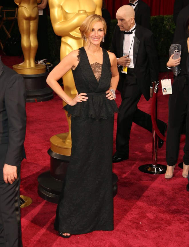 First of all, the dress was not my thing. Bored now. I get that Julia slides herself firmly into the "classics" category and isn’t going to try anything new and risqué. Tough luck for us. If she’s nominated again sometime, it’s going to be black matte satin. Possibly with white trim.