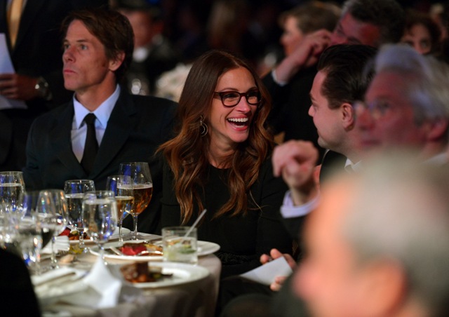 How can you win this argument when she has her glasses on, probably lecturing him about something, or laughing about Jennifer Lopez’s waiter-bear, as her husband sits mute on the other side? And then there’s her dress. She barely bothered, you know? She doesn’t think she has to bother anymore because she’s Julia Roberts. She’s Julia Roberts so, naturally, she gets to present the most important award of the night. And, you’ll note, she only presents to her friends. This after all is the Hollywood Foreign Press Association. They probably assured her of it beforehand. Yes, Julia, you’ll be presenting to your friend, George Clooney. And you can spend the rest of the night nattering at Leo about why he only dates Victoria’s Secret models. What? You don’t think she would? She would. And he couldn’t say sh-t back to her.