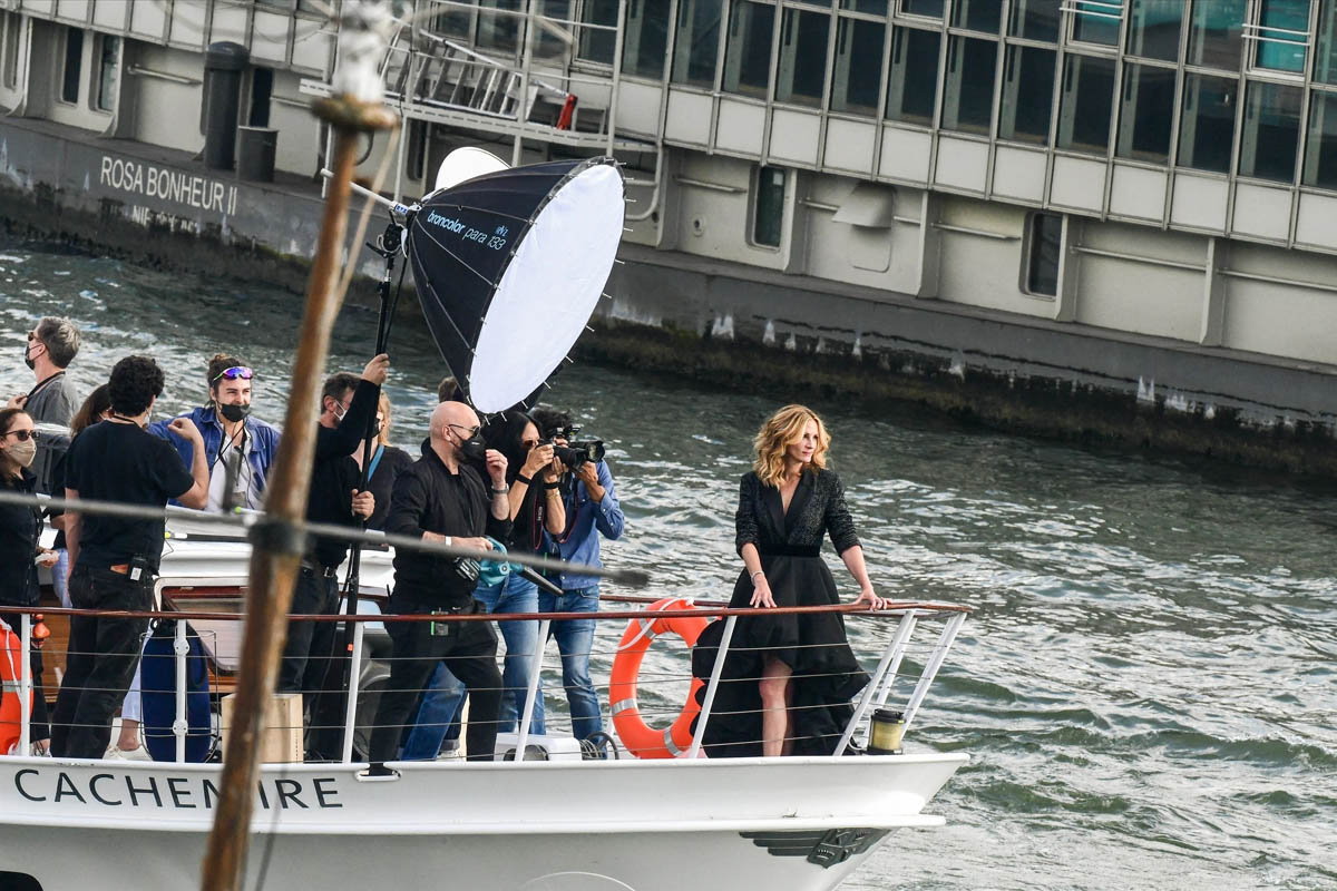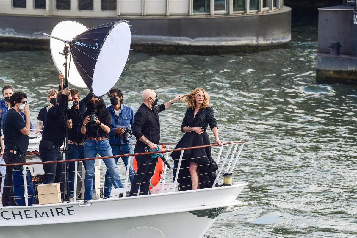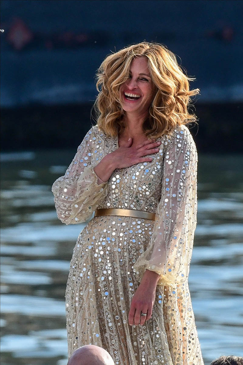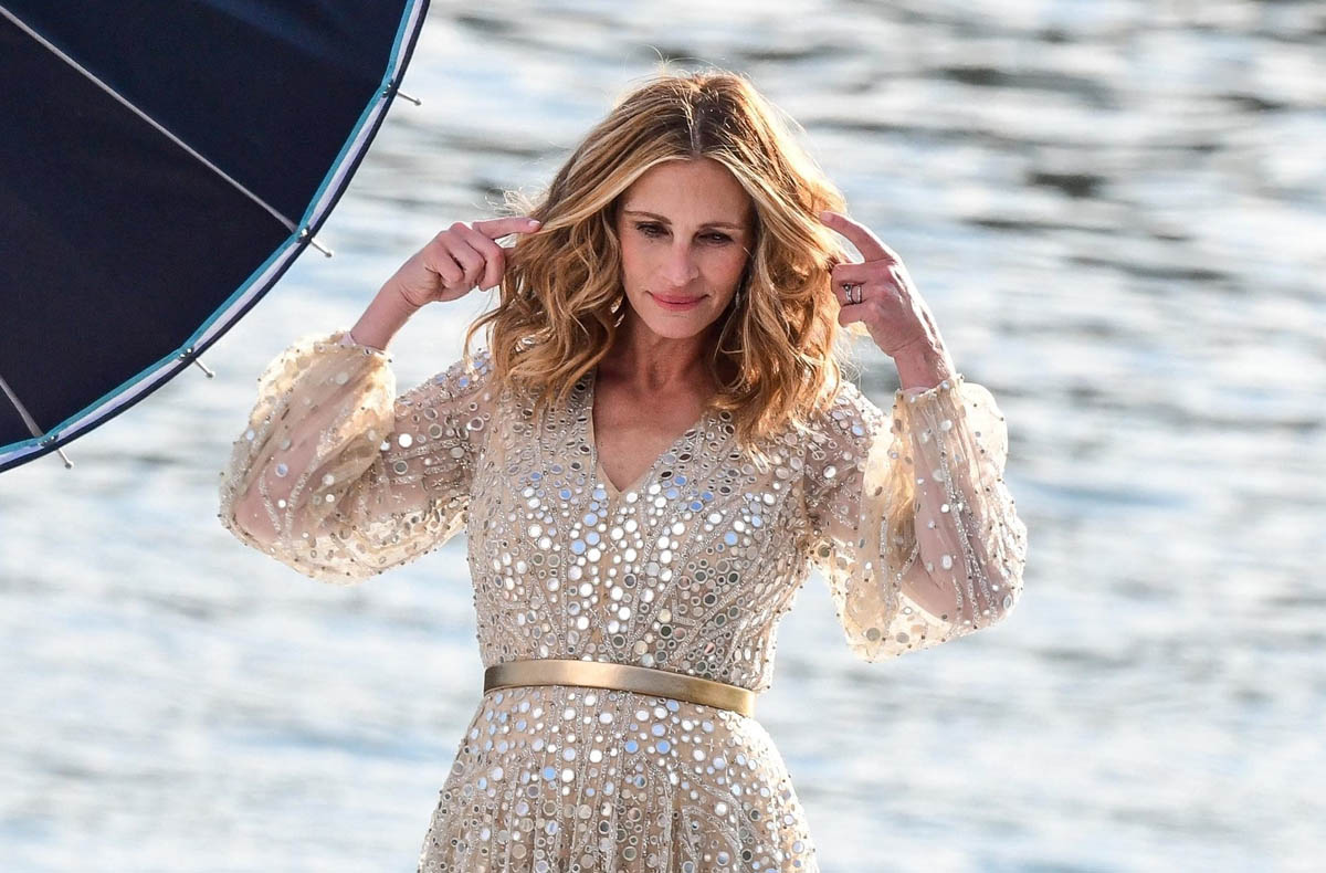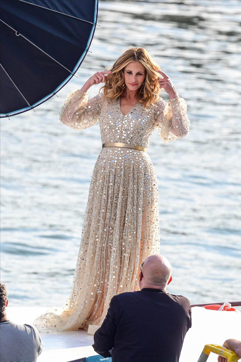Look at this Carolina Herrera dress. Does it remind you of another famous dress? It’s not exactly the same, not at all. And you might not even say it’s “inspired by” either. It’s just… they could be related. Julia Roberts, Valentino, remember? When she won her Oscar? Julia, by the way, is currently in Paris shooting a new ad for Lancome. She looks so glorious I had to attach them to this post. (Go Fug Yourself)
