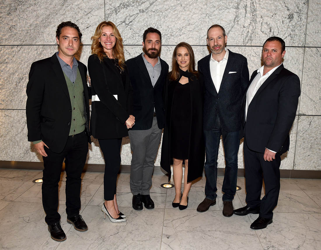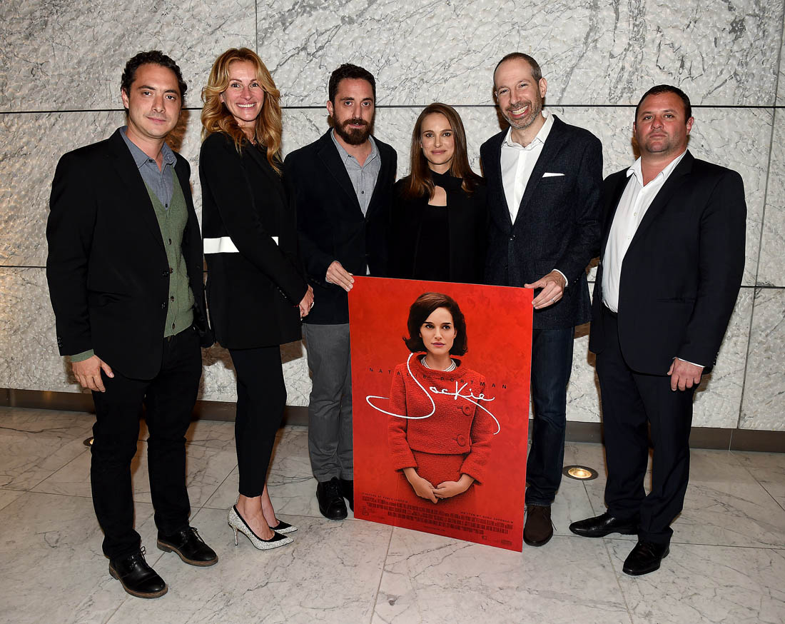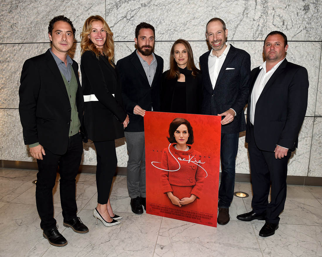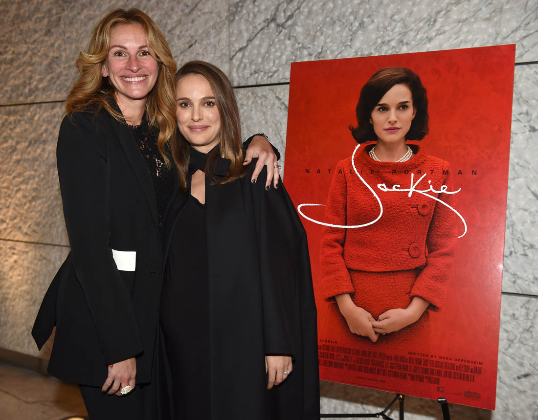 Here’s Julia, with Natalie, at a Jackie screening for AMPAS members in LA on Thursday. To be annoyingly and obviously clear, that’s the Academy of Motion Picture Arts and Sciences in the presence of two Oscar winners last, both of whom excel at the art of buttering up. More on that in a minute. First, let’s go back to the Julia-Natalie history. They worked together on Closer. And then, in 2007, when Julia was honoured by the American Cinematheque, Natalie spoke at the event and talked about their bond – video below, if you want to skip the introduction, start at 0:55: