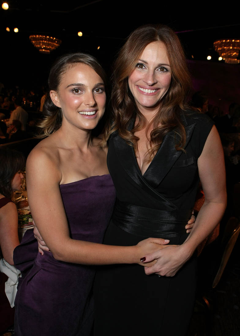 Joanna wrote in the previous post about Reese Witherspoon’s support of Natalie Portman. I wrote on Tuesday about Tom Hanks’s support of Natalie Portman in Palm Springs and how, well, even though Emma Stone had the early momentum for Best Actress, you can’t mistake the signs now – Natalie Portman has probably overtaken Emma for the lead in a race that was thought to be the most competitive in years but…I’m starting to think that she’s already got it locked up. Last night Julia Roberts stood up for her.