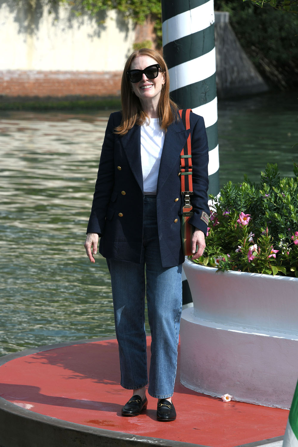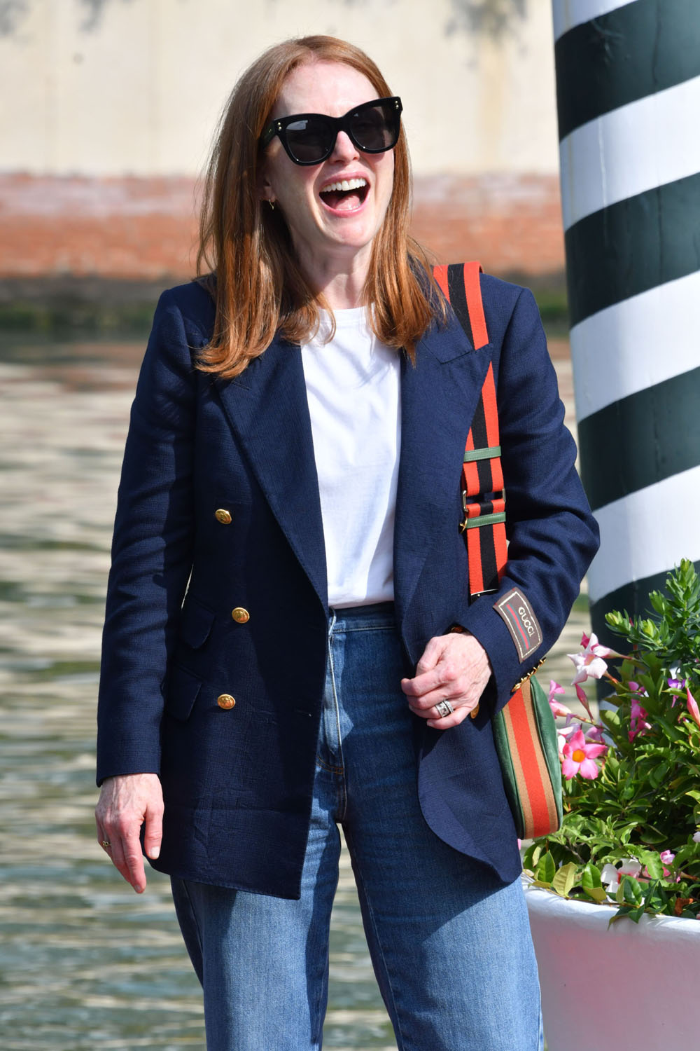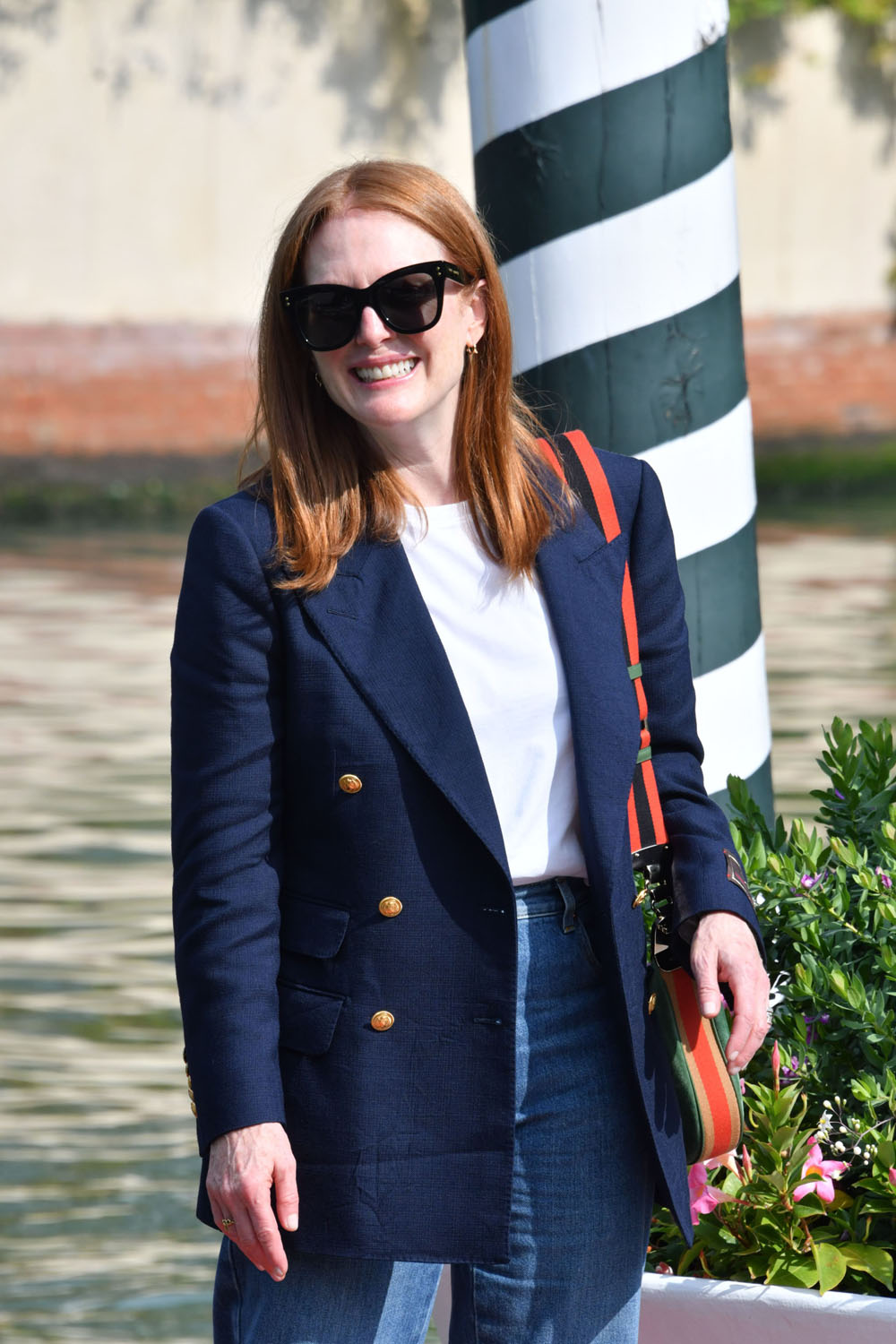 The Venice Film Festival opens tomorrow night. Here’s this year’s jury president, Julianne Moore with festival director Alberto Barbera today to kick off the festivities. Julianne’s main focus as the president, obviously, will be to consider all the films in contention and work with her jury counterparts to make their selections. But also, as the jury president, she’ll be expected at every gala and whatever other sponsorship and partnership events over the next couple of weeks. It can be a pretty intense schedule. And she’ll have a look for each and every appearance. Will be interesting to see what she and her stylist, Leslie Fremar (at least I think it’s Leslie Fremar, they’ve been working together for years), come up with. Today it was a classic blazer over jeans…and Gucci. Double Gucci. There’s a tote and a shoulder bag.