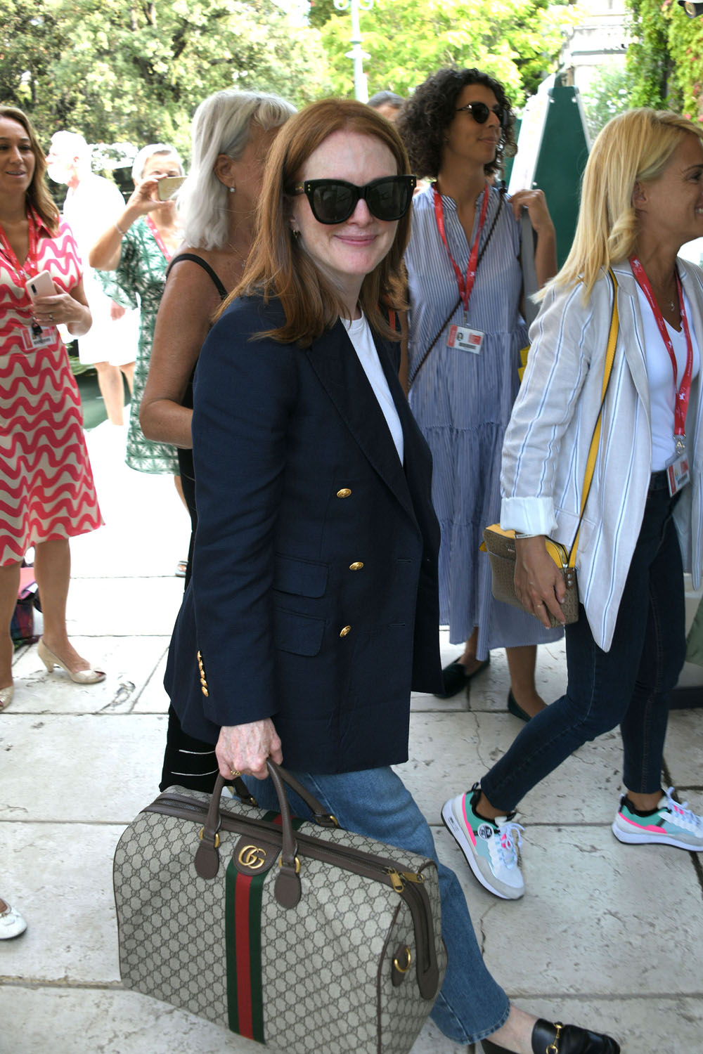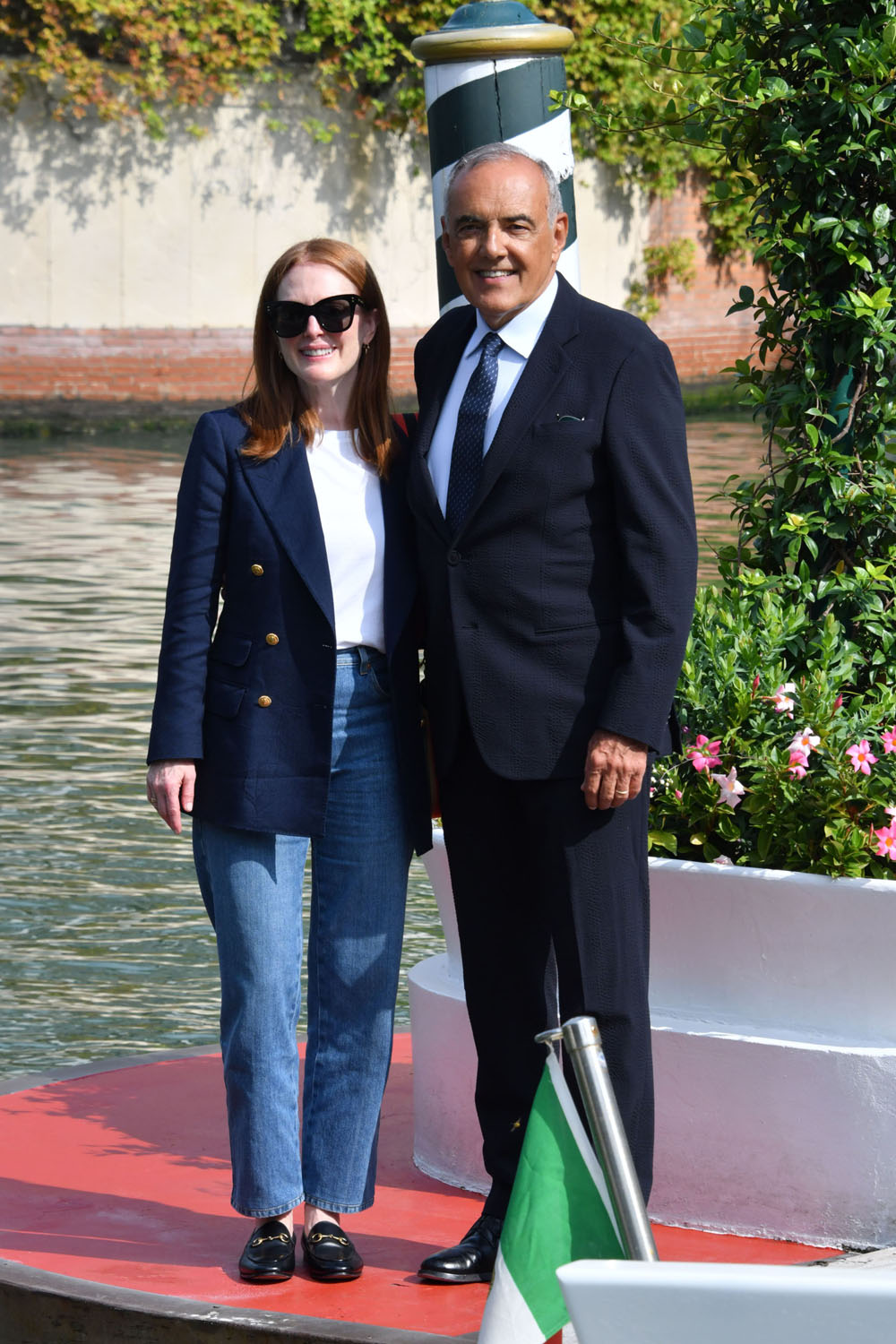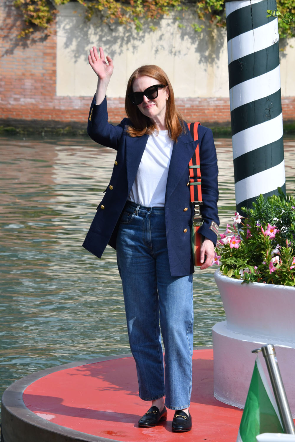 The Venice Film Festival opens tomorrow night. Here’s this year’s jury president, Julianne Moore with festival director Alberto Barbera today to kick off the festivities. Julianne’s main focus as the president, obviously, will be to consider all the films in contention and work with her jury counterparts to make their selections. But also, as the jury president, she’ll be expected at every gala and whatever other sponsorship and partnership events over the next couple of weeks. It can be a pretty intense schedule. And she’ll have a look for each and every appearance. Will be interesting to see what she and her stylist, Leslie Fremar (at least I think it’s Leslie Fremar, they’ve been working together for years), come up with. Today it was a classic blazer over jeans…and Gucci. Double Gucci. There’s a tote and a shoulder bag.