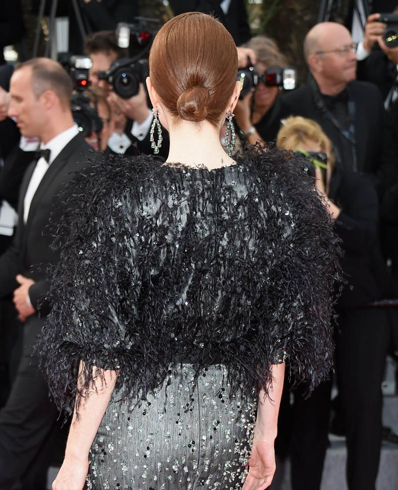 What do you wear on a Cannes carpet? Think of it like the Oscars… tweaked Euro. There is no such thing as too much. So Julianne’s deep cut, feathers, and sparkles? Perfect. I mean you’re not going to go wrong anywhere in this outfit but especially here, sur le tapis rouge, it’s perfect. And so of the moment. This is not a dress that feels like it already had its time…