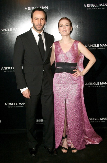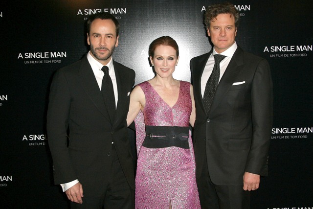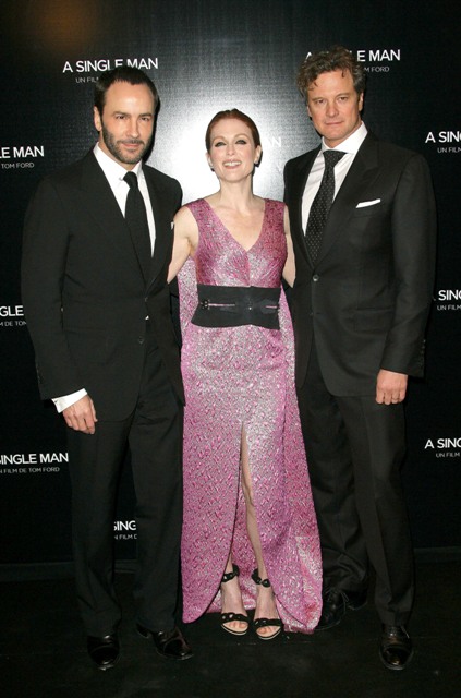 Julianne Moore was surrounded by the Men, the most beautiful Men, last night in Paris at the premiere of A Single Man. Lucky bitch. Here she is, flanked by Colin Firth and Tom Ford, her second film screening in as many days, having just promoted Chloe earlier this week. Not crazy about her dress, but do love the theatricality of the cape. Capes are the best. When Alan Rickman wears his Snape Cape the loins ignite immediately. I’m telling you, if it was appropriate, I’d walk around in a cape all day.