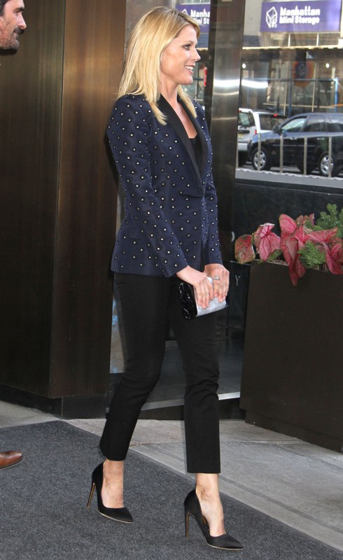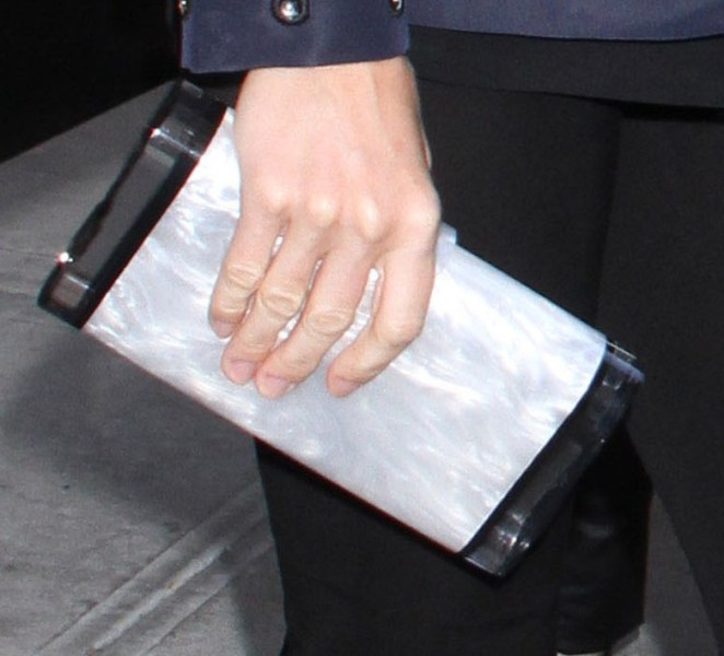 The blazer looks great on her over those pants. And a solid pair of black pumps. The clutch though is the weakest part.