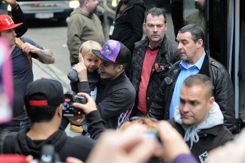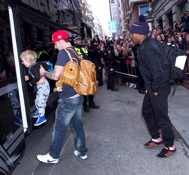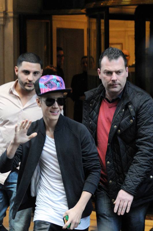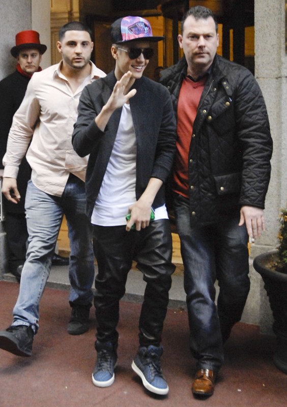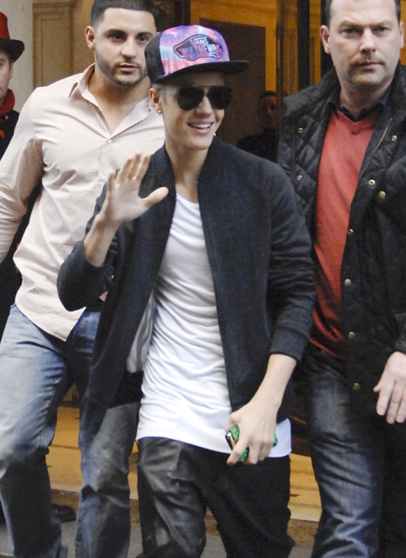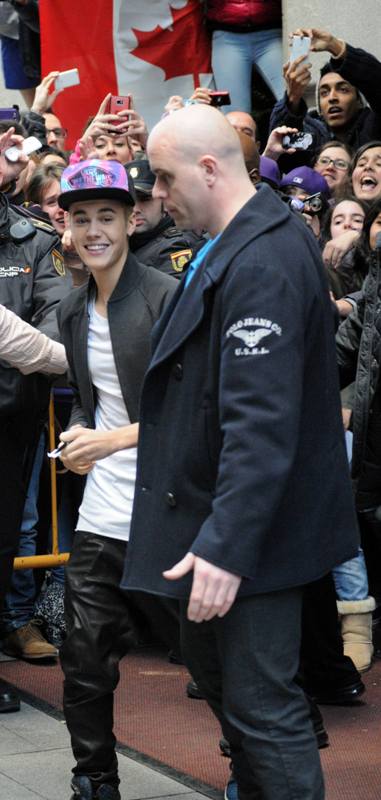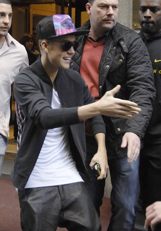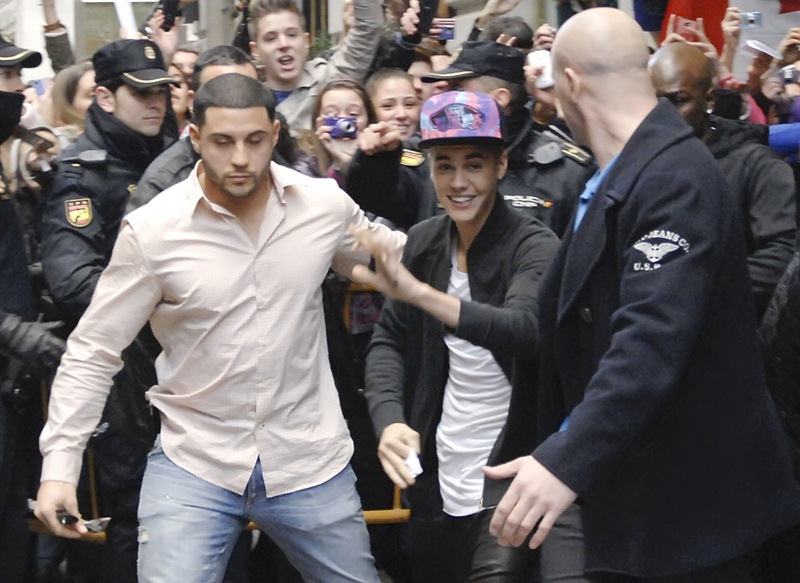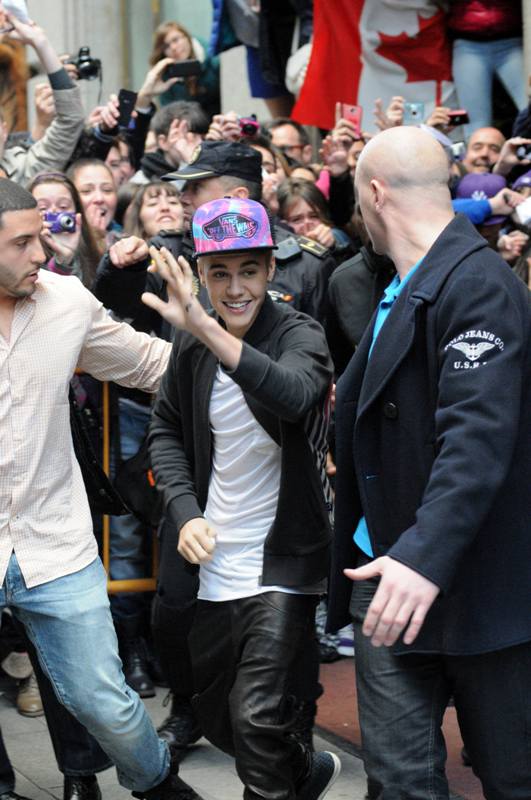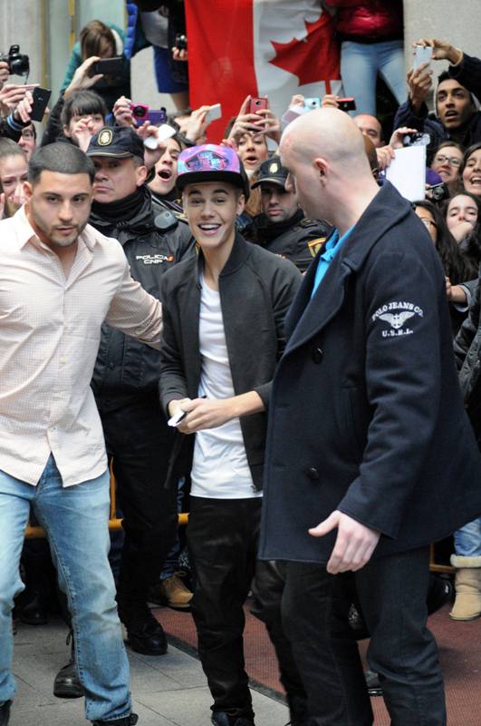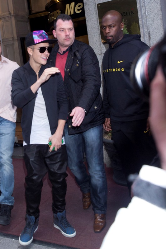 Justin Bieber is now in Spain. He performed in Madrid last night. This is a different face than the one we saw for a couple of weeks in England where he celebrated his 19th birthday by taking his shirt off, arguing with club owners over age restrictions, collapsing on stage, shouting at people over Twitter, and threatening to f-ck up the paps while being lifted out of his car seat by his babyguard.
