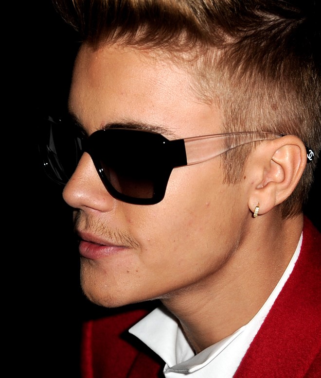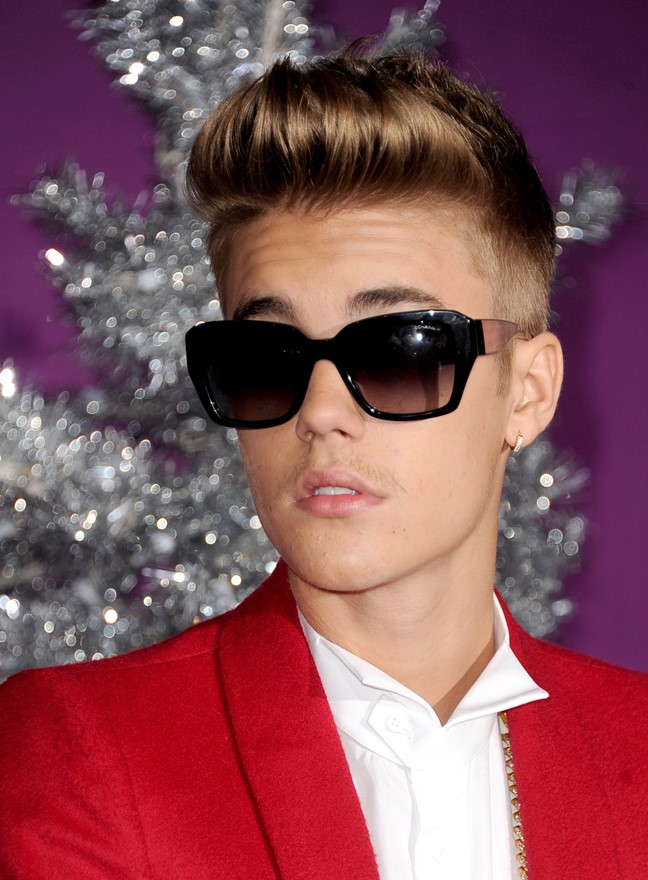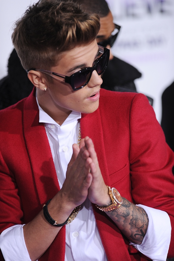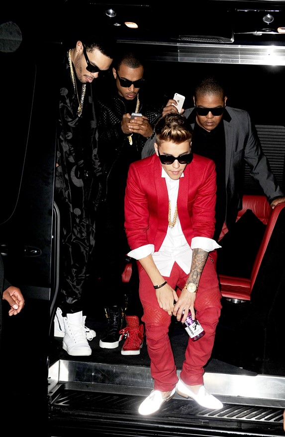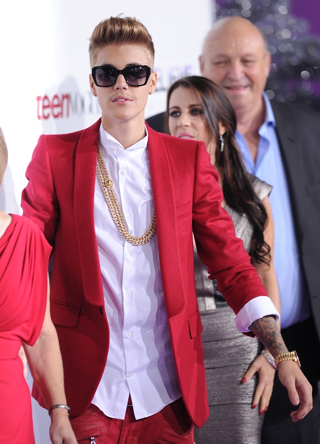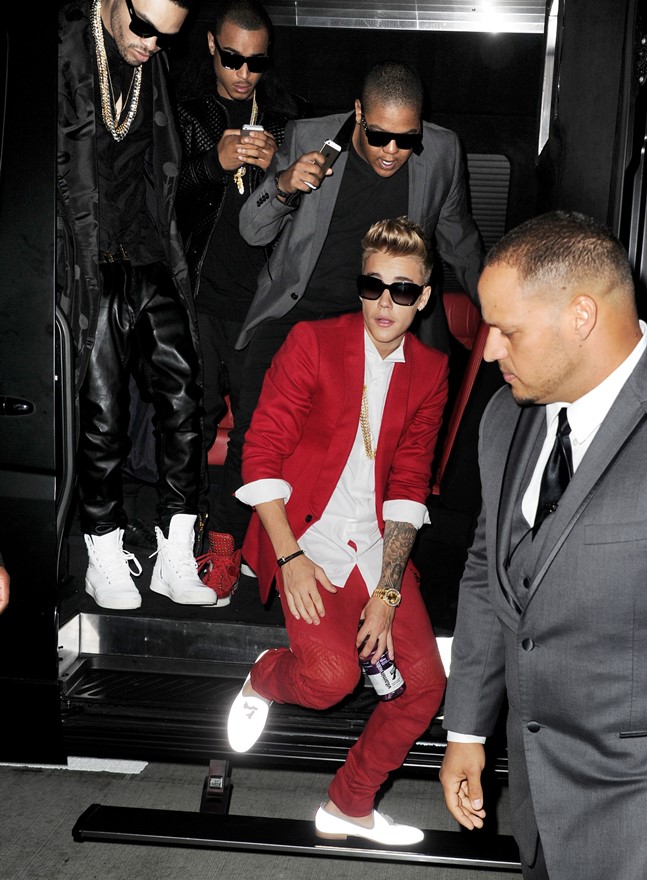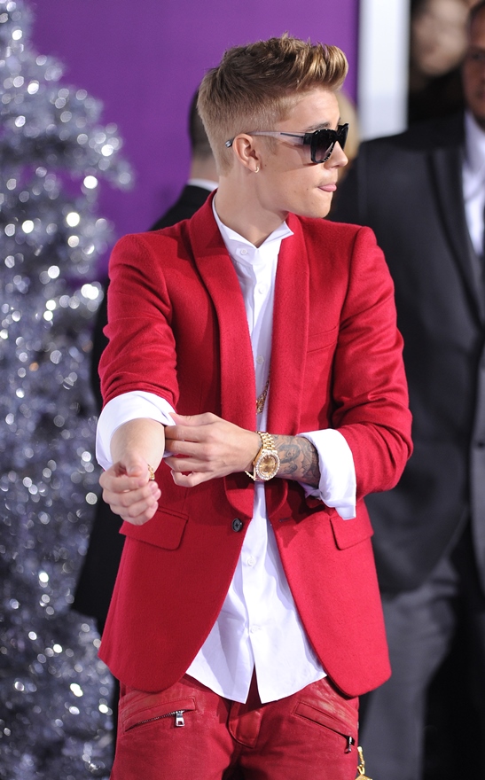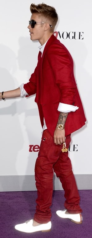 Justin Bieber wore a red suit and a douche-face to the premiere of his movie Believe last night. Also, some Miami Vice on his feet.