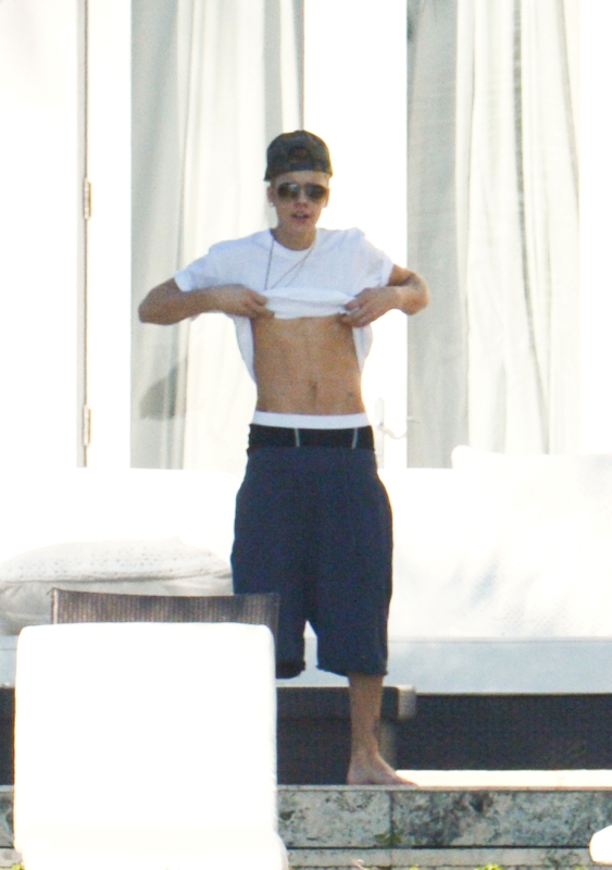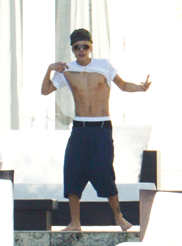 These pics were just snapped of Justin showing off his body for photographers in Miami, and well, I’m not saying that Justin Bieber looks like a douche. I’m NOT saying that. I’ve seen Justin in person. I actually produced his first TV interview ever, and during those times he was nice and well behaved. So let me repeat, Beliebers, I’m NOT saying that Justin Bieber looks like a douche. I’m just sayin’…lifting up your t-shirt…for paparazzi…to show off your man-boy abs…that might be something that a douche does? He truly is Usher’s protégé.
