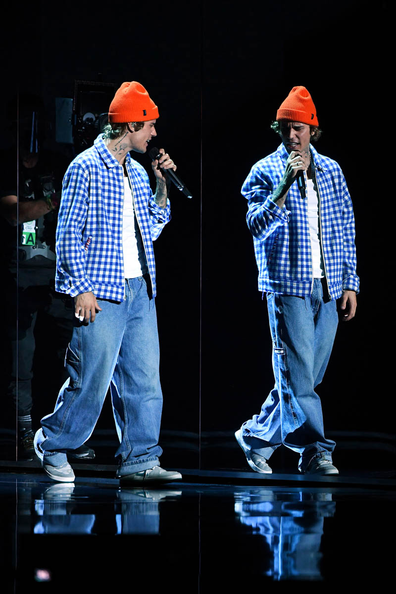 Justin Bieber opened the American Music Awards last night with back-to-back performances of his songs “Lonely” and “Holy”. It’s been almost a year since JB announced his return to music, eventually releasing his fifth studio album, Changes, with plans for a world tour. Nobody went on tour this year but JB has continued to put out new music, calling it a new “era”, and the last couple of months have certainly felt more like a new “era” than it did in January. In some ways, I feel like perhaps this gradual ease back to the stage has been beneficial for him. Because JB had a hard time with the pressure, with the touring, with the attention, and getting right back out there with that schedule, which is grueling, after he’s been quite candid about how he’s struggled with that life in the past, it would have been a lot. And that’s how it works – you go from idling to sixth gear, no breaks in between. But the way it’s worked out, JB has been able to take the steps gradually. Maybe that’s had nothing to do with what we saw from him last night. But there was a passion to his performance, a commitment to the work – he was feeling the songs, the lyrics, he sounded great…