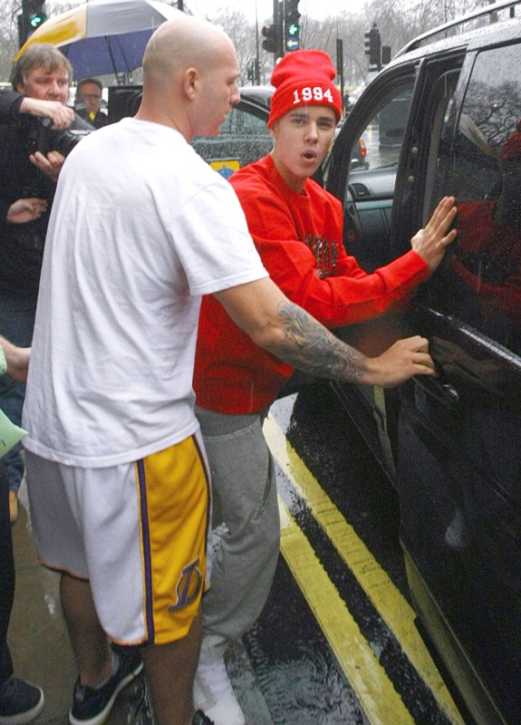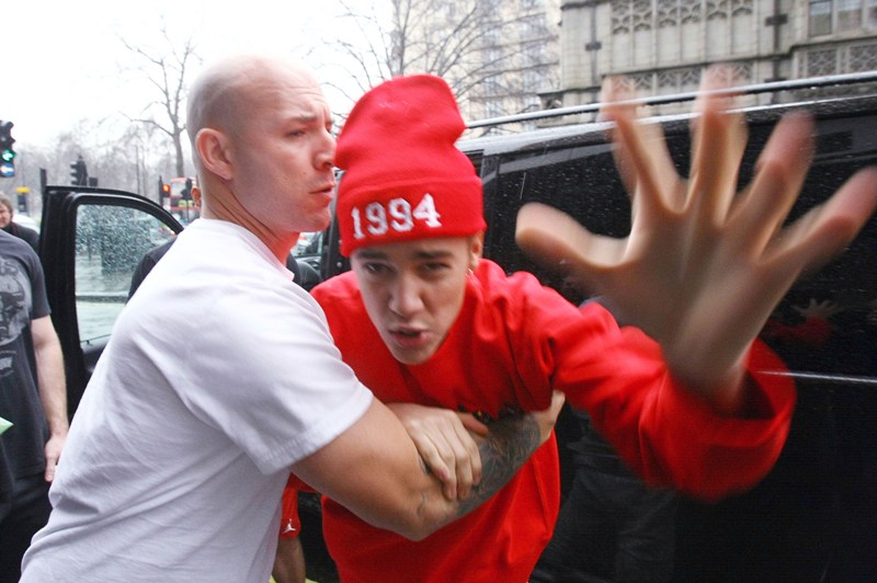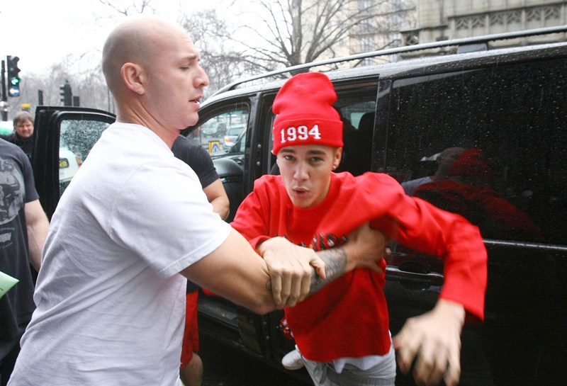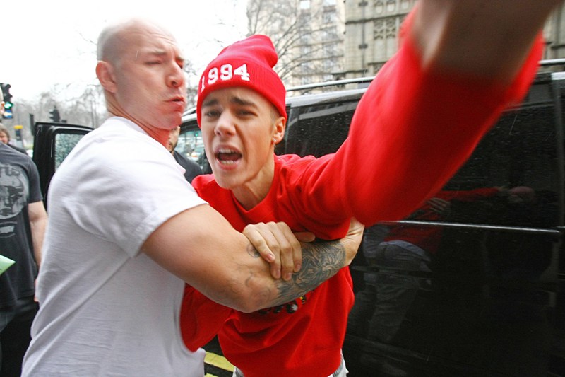 Bieber has to be “restrained” by his bodyguard from attacking...