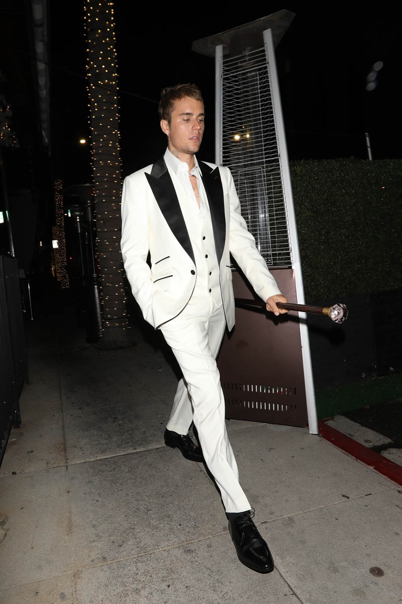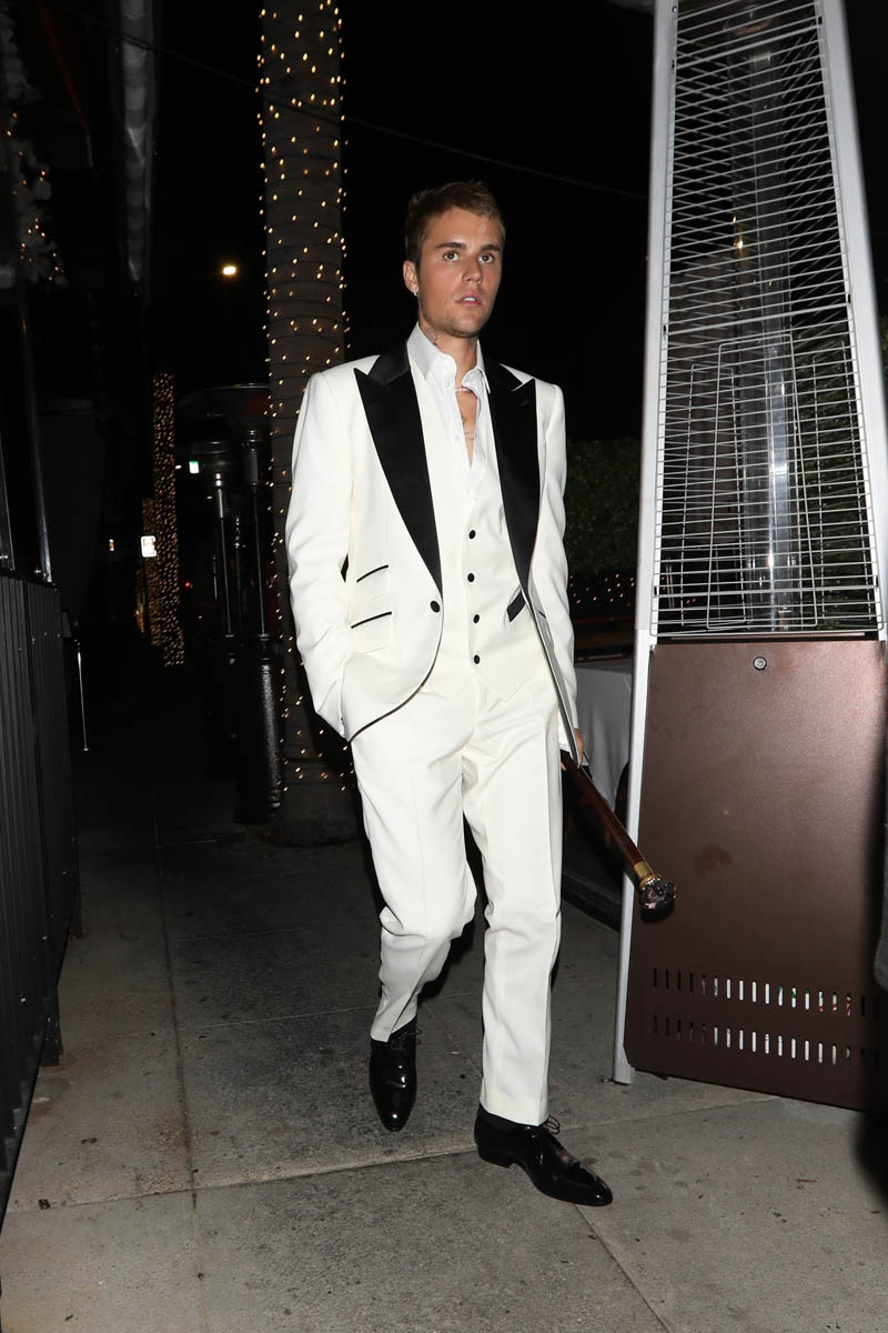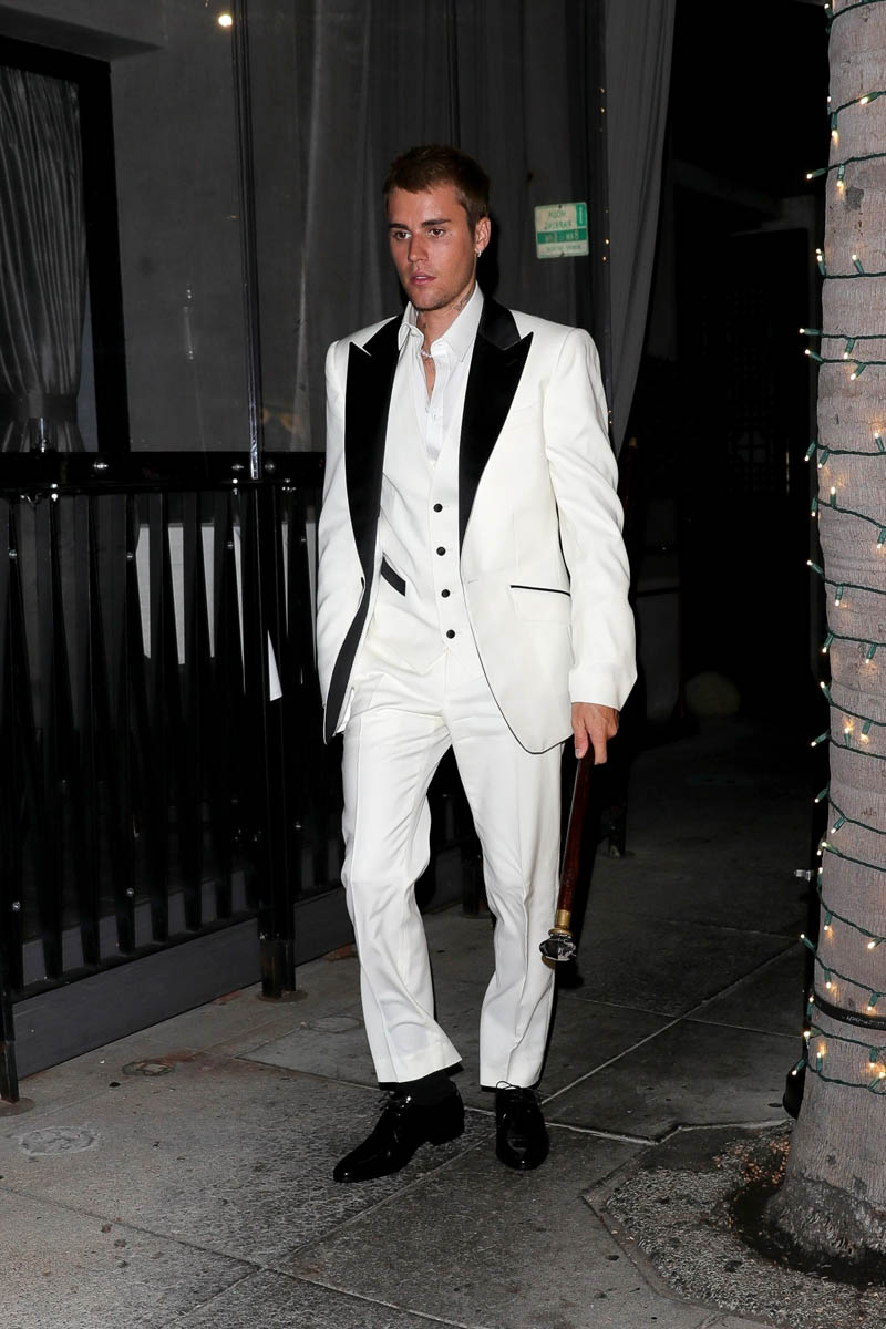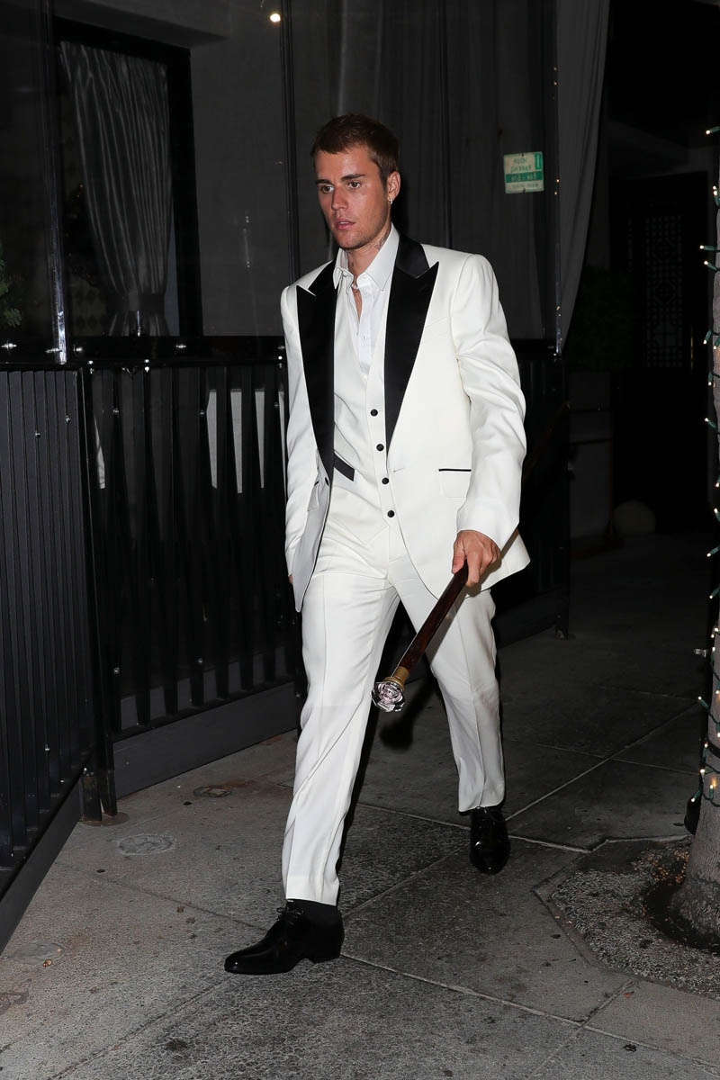 Speaking of celebrities dressing up, which I mentioned in the previous post about Thandiwe Newton and Nico Parker, Justin Bieber, who doesn’t often dress formally – in fact he dresses almost aggressively INformally – was out for dinner last night in a white suit with black lapels, and a cane. Drama!