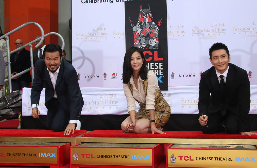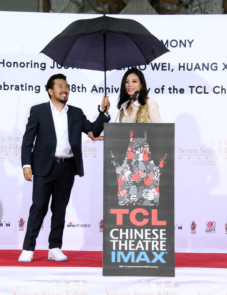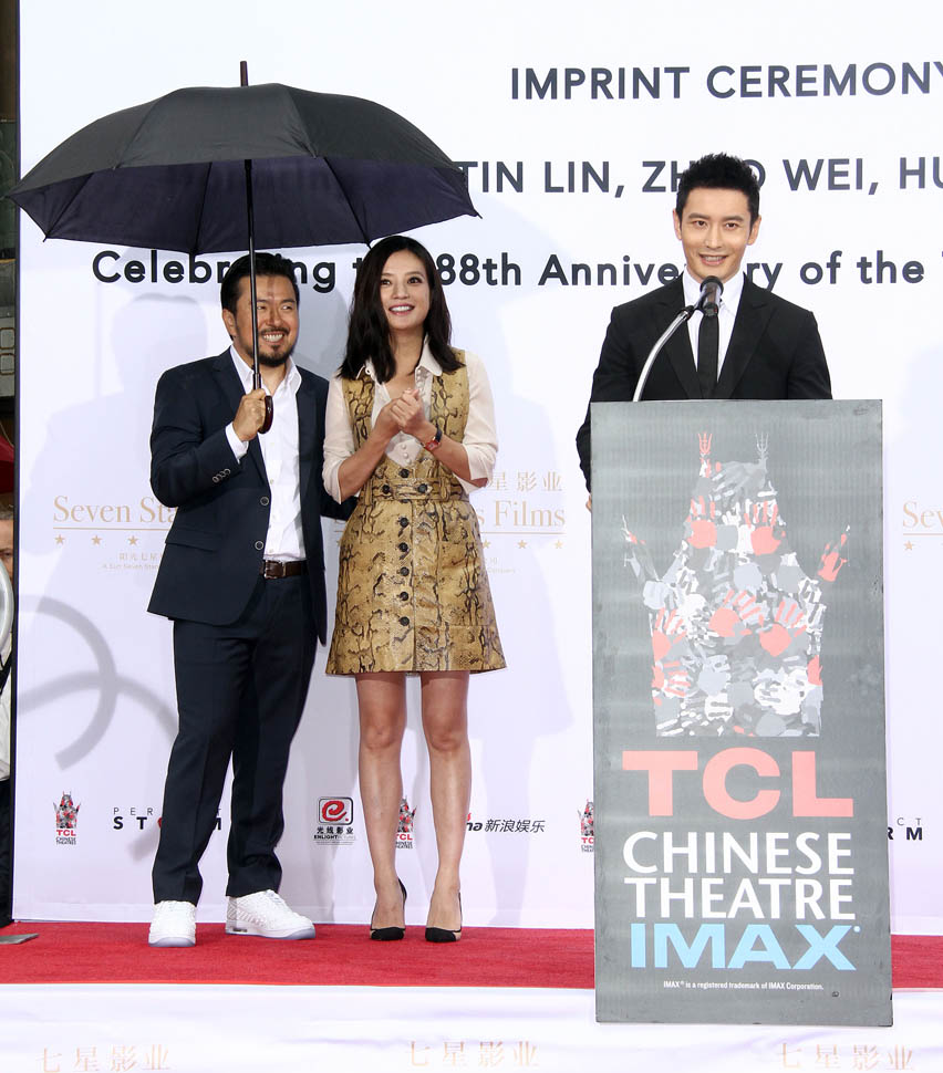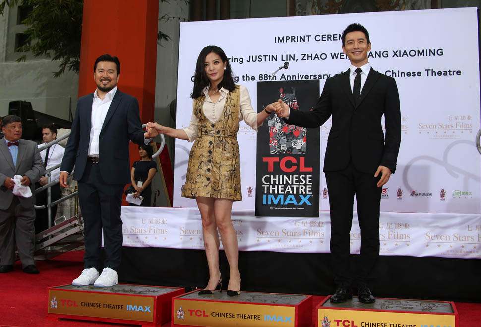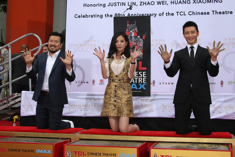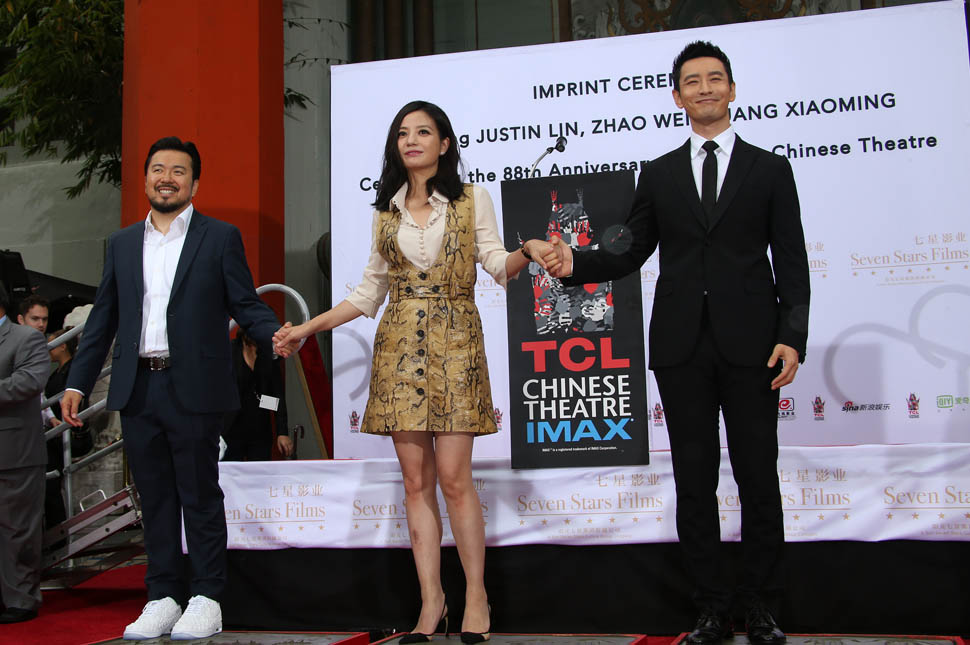 It’s the 88th anniversary of the Chinese Theatre in Hollywood. To celebrate, Justin Lin, Zhao Wei, and Huang Xiaoming were honoured with a hand and footprint ceremony yesterday. Lin, as you know, is from the Fast and Furiouses and, now, Star Trek 3, which he’s currently working on in Vancouver. Zhao Wei has been one of the most popular and bankable actors in Asia, and she recently directed her first movie – it was a big ass deal. As for Huang Xiaoming, many Asians consider him to be one of the most beautiful men of all time. My ma showed me an article once that proclaimed him the face of a generation. I’ve never seen it. A face like Nicholas Tse’s is more my flavour. But anyway, the best thing about Huang Xiaoming? His wife.