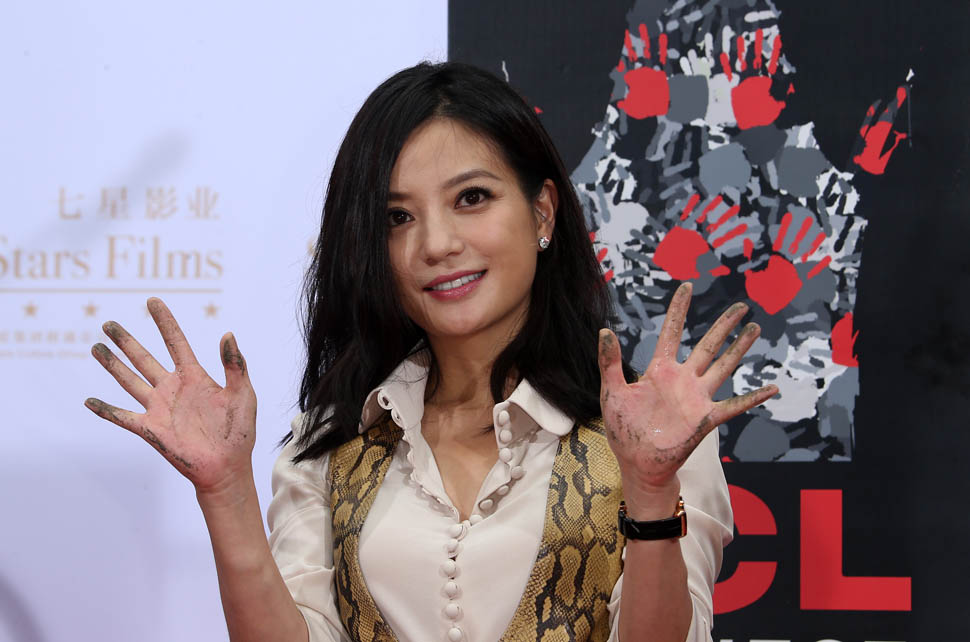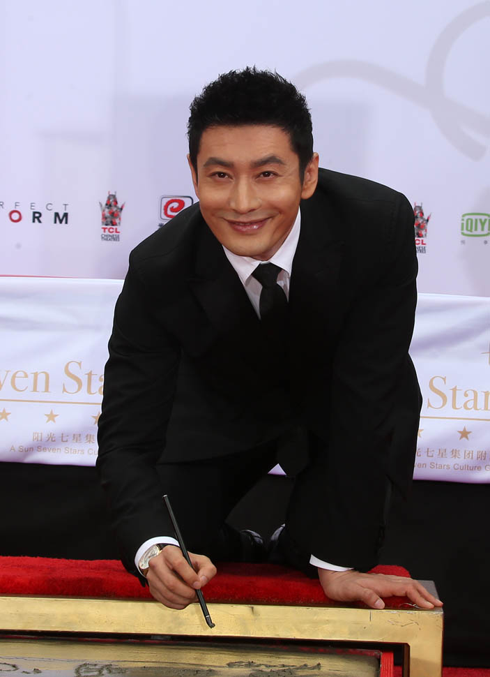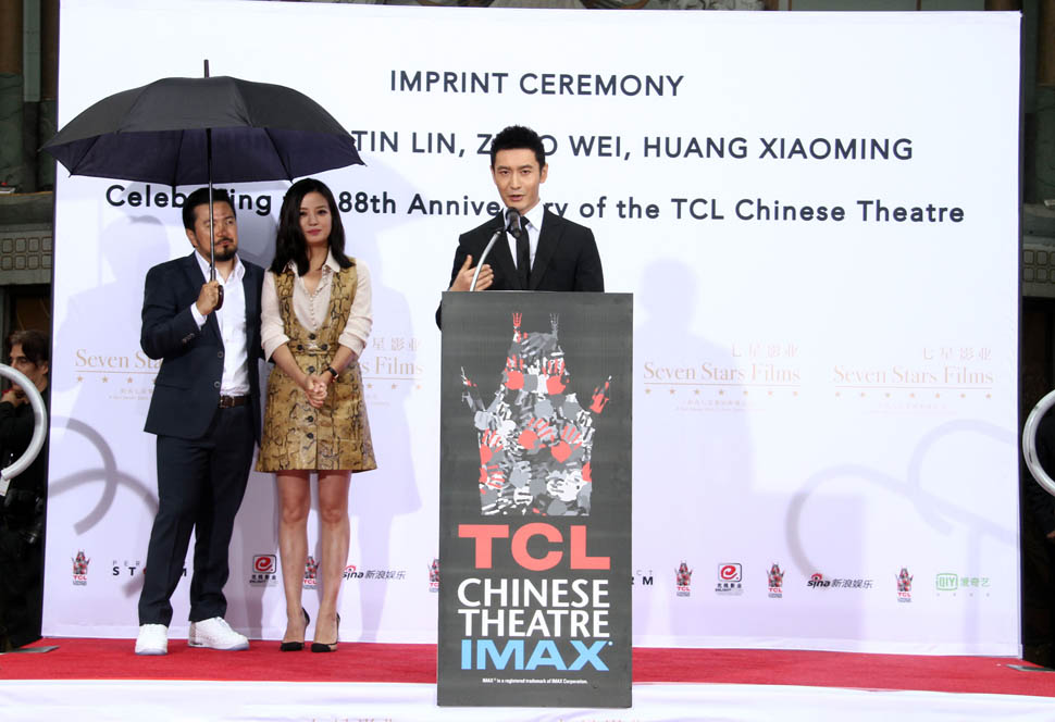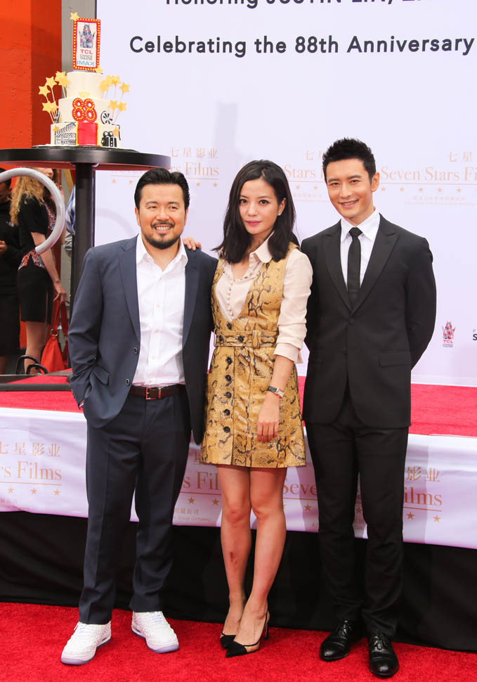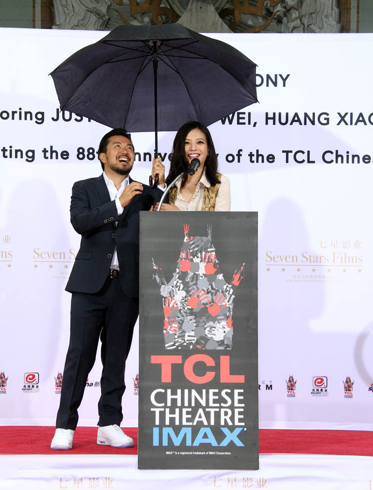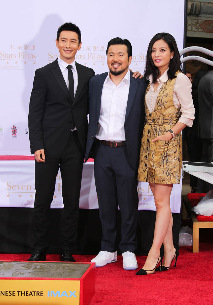 It’s the 88th anniversary of the Chinese Theatre in Hollywood. To celebrate, Justin Lin, Zhao Wei, and Huang Xiaoming were honoured with a hand and footprint ceremony yesterday. Lin, as you know, is from the Fast and Furiouses and, now, Star Trek 3, which he’s currently working on in Vancouver. Zhao Wei has been one of the most popular and bankable actors in Asia, and she recently directed her first movie – it was a big ass deal. As for Huang Xiaoming, many Asians consider him to be one of the most beautiful men of all time. My ma showed me an article once that proclaimed him the face of a generation. I’ve never seen it. A face like Nicholas Tse’s is more my flavour. But anyway, the best thing about Huang Xiaoming? His wife.