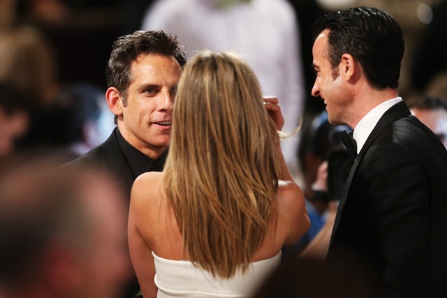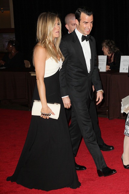 I have more to say but that was my first thought looking at these photos of Jennifer Aniston and Justin Theroux at the American Cinematheque Award Ceremony last night honouring Ben Stiller. Justin in particular seems super sweaty.