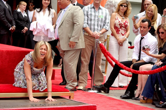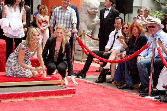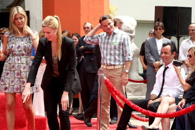Jennifer Aniston’s hand and footprint ceremony happened yesterday. It’s a much bigger deal than a star on the Walk of Fame. Conveniently timed of course for the release of Horrible Bosses. Just like her new boyfriend who was there, in the front row, right beside her producing partner, cheering her on, and receiving flying kisses from her periodically throughout the ceremony.