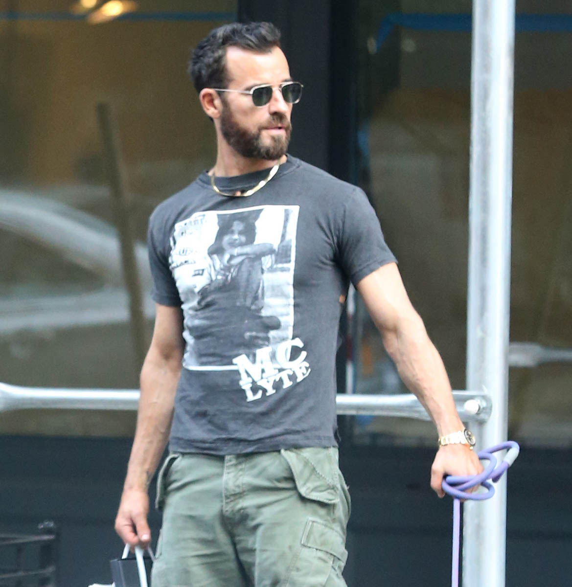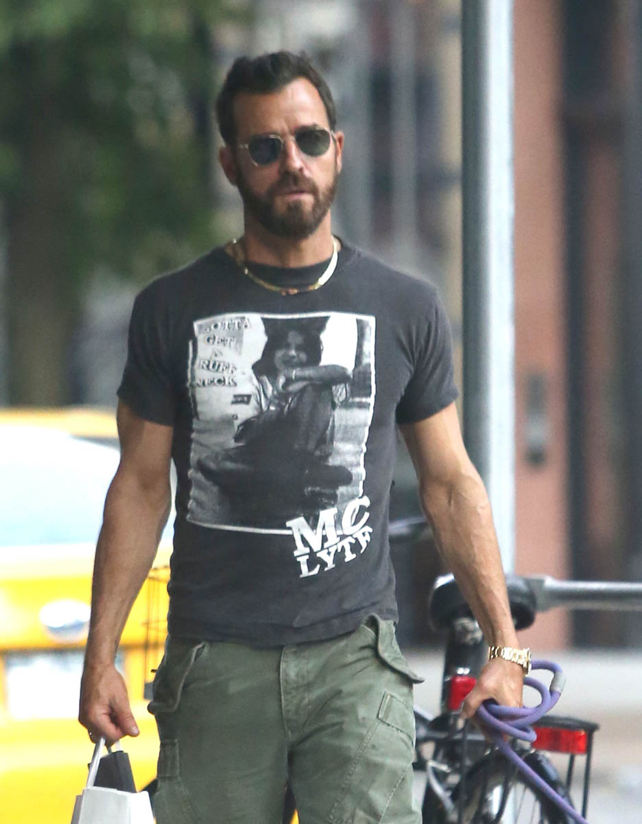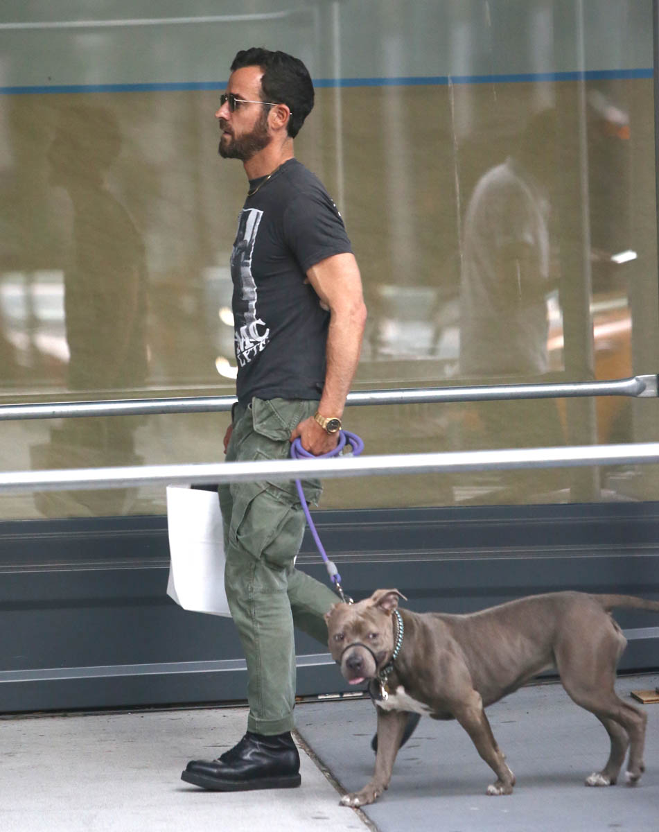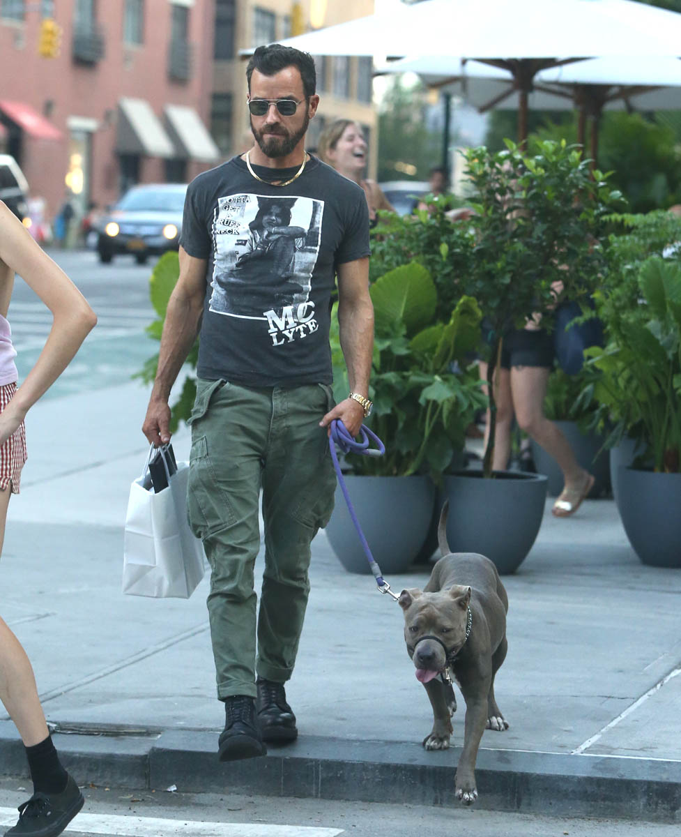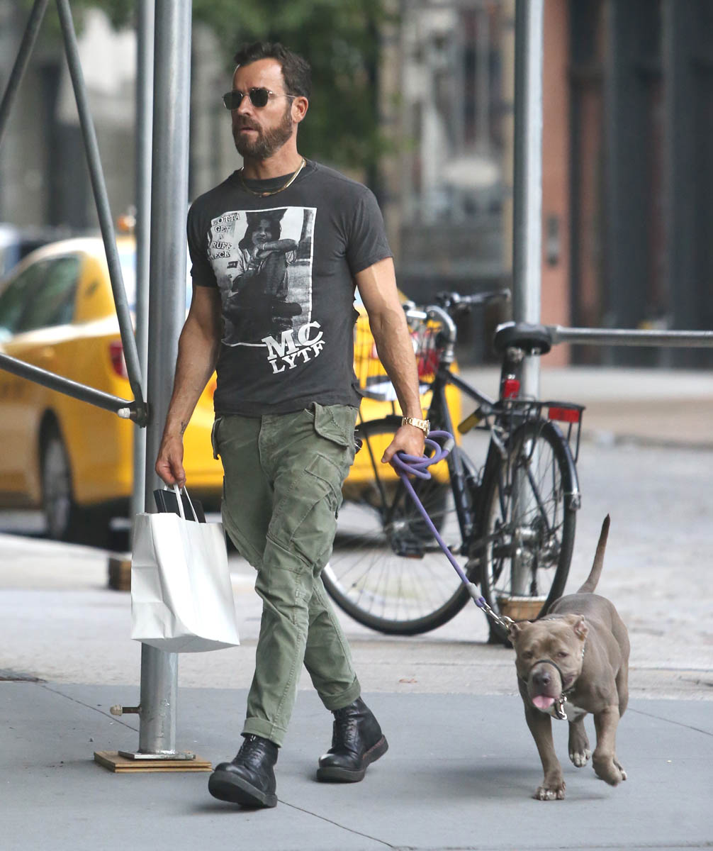Attached - Justin Theroux out in New York with his dog last month.