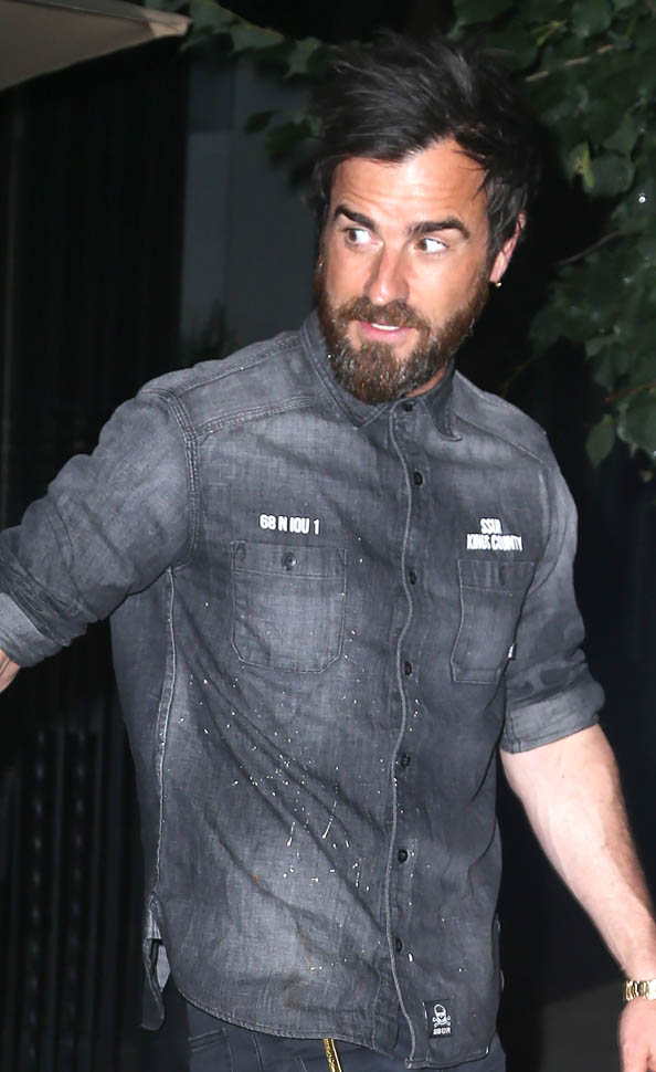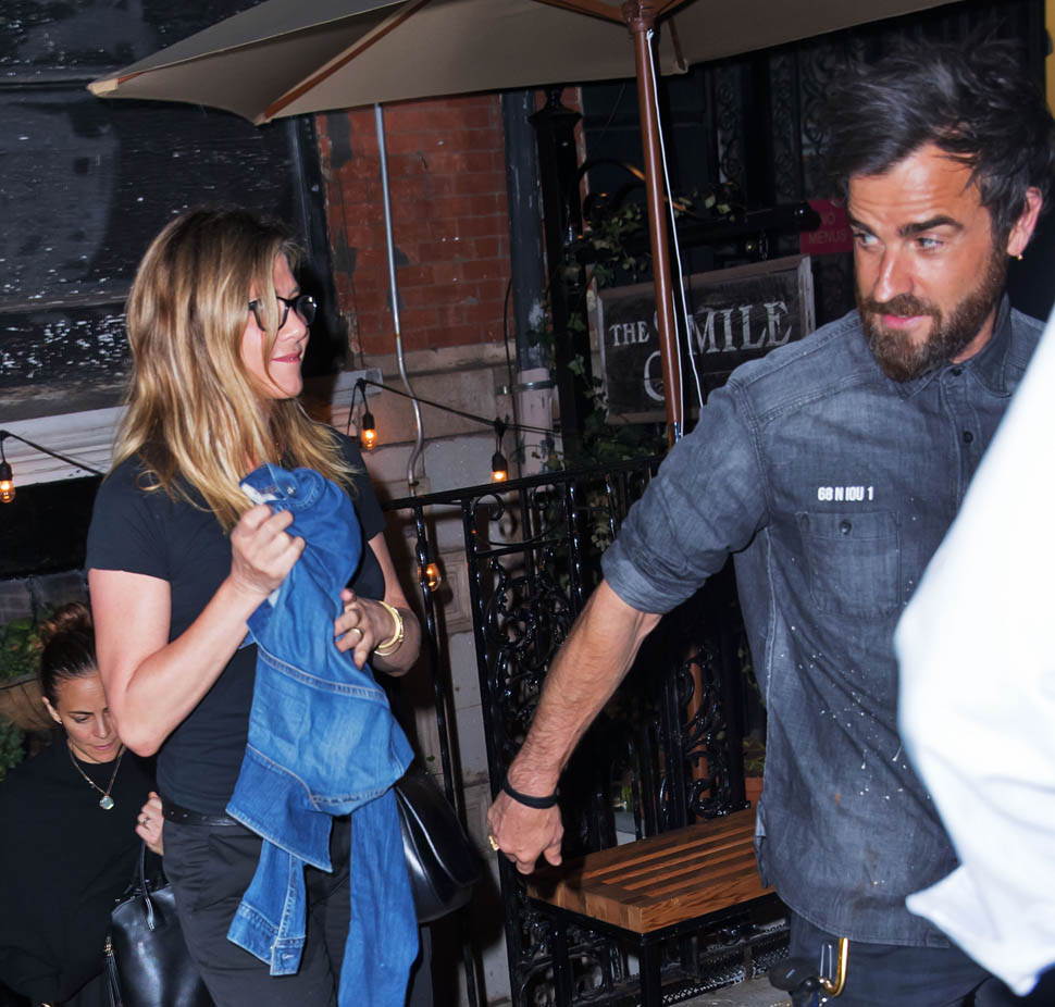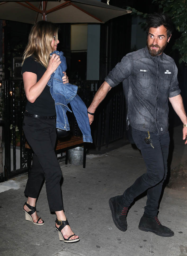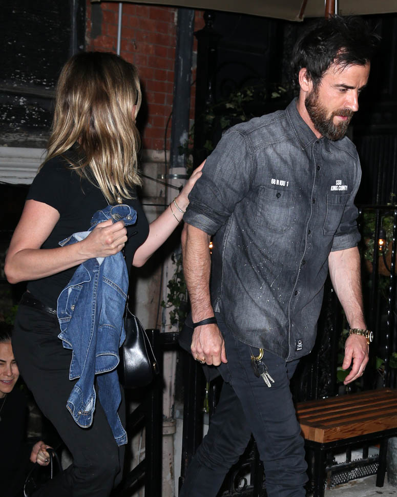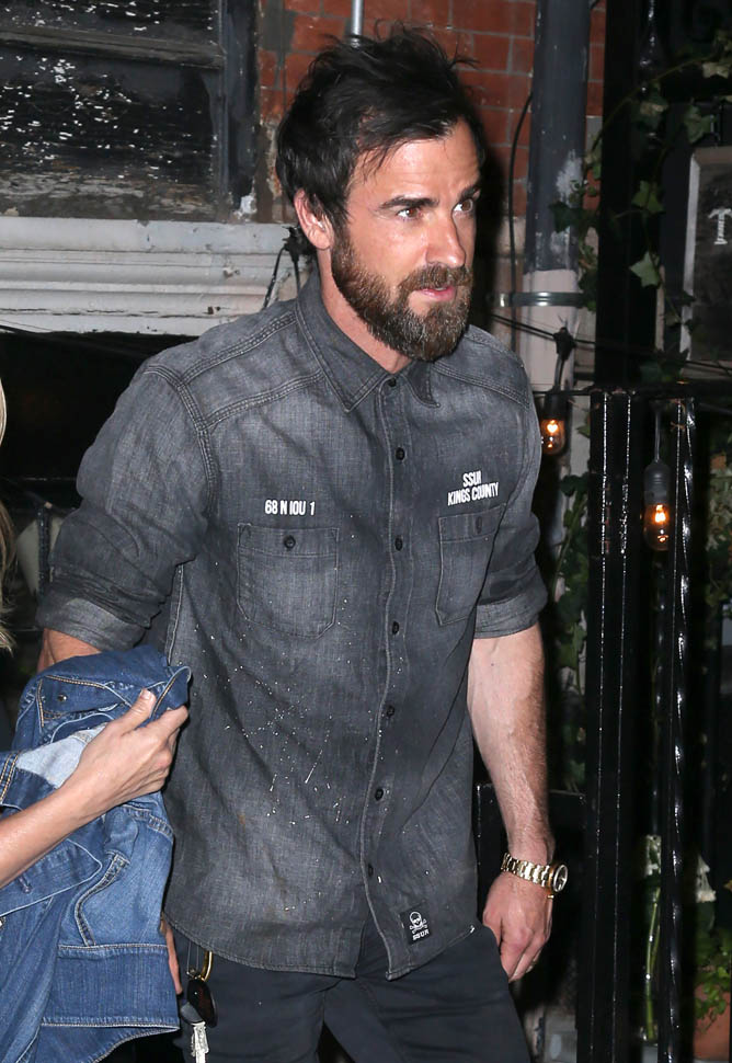 When I picture Justin Theroux, in my mind, his hair is always combed back. And he’s got quite a distinctive hairline. Last night he and Jennifer Aniston went out for dinner in New York. This is a different look. I dig it. And, ahem, it does more than just the job of making him look attractive.
