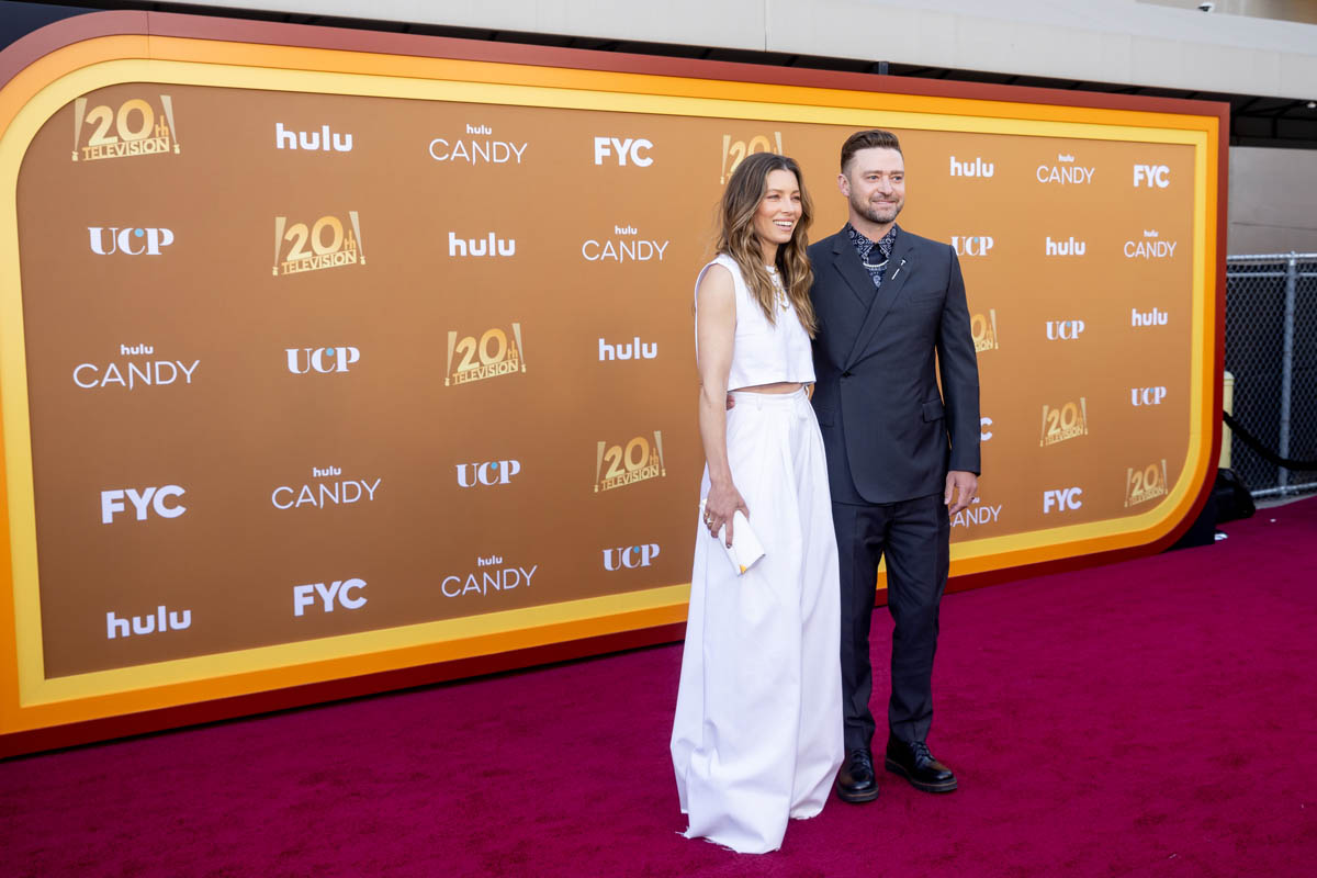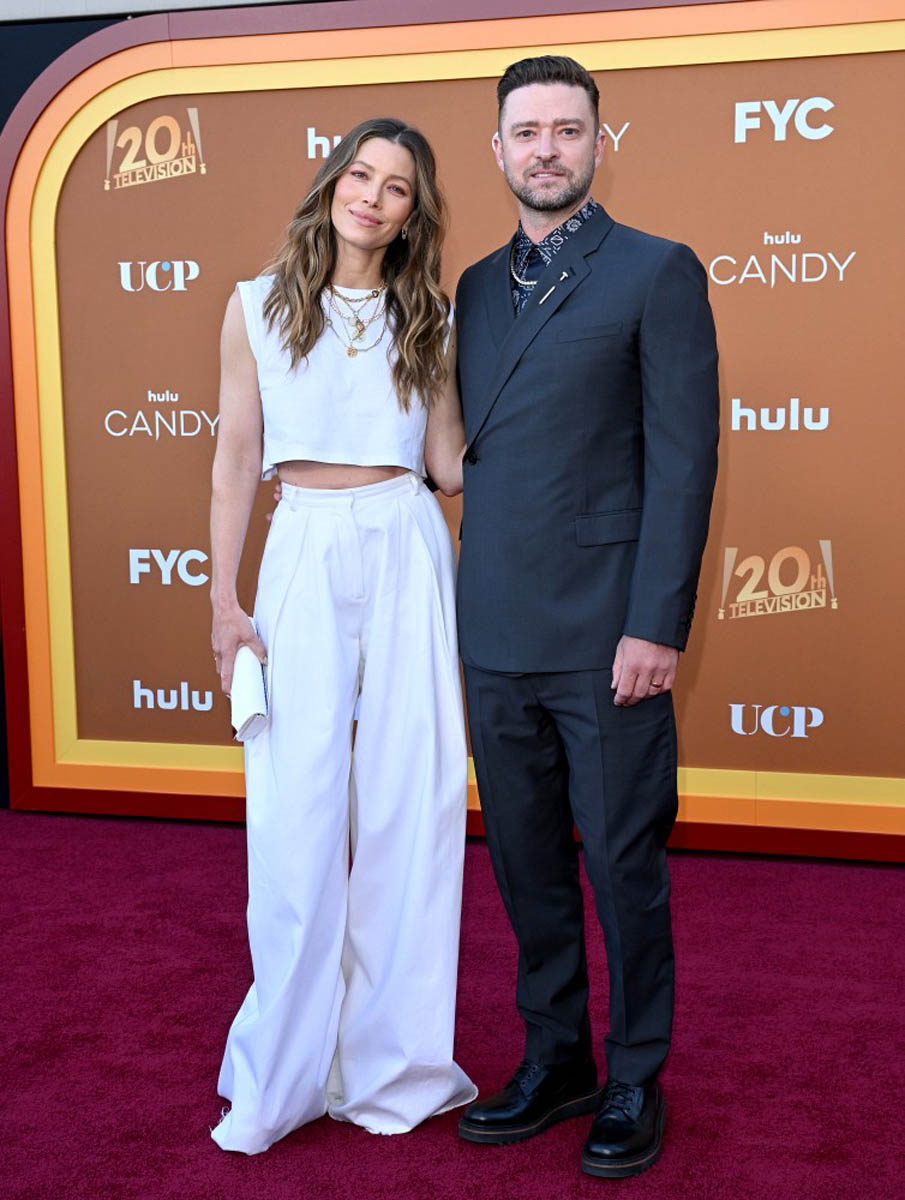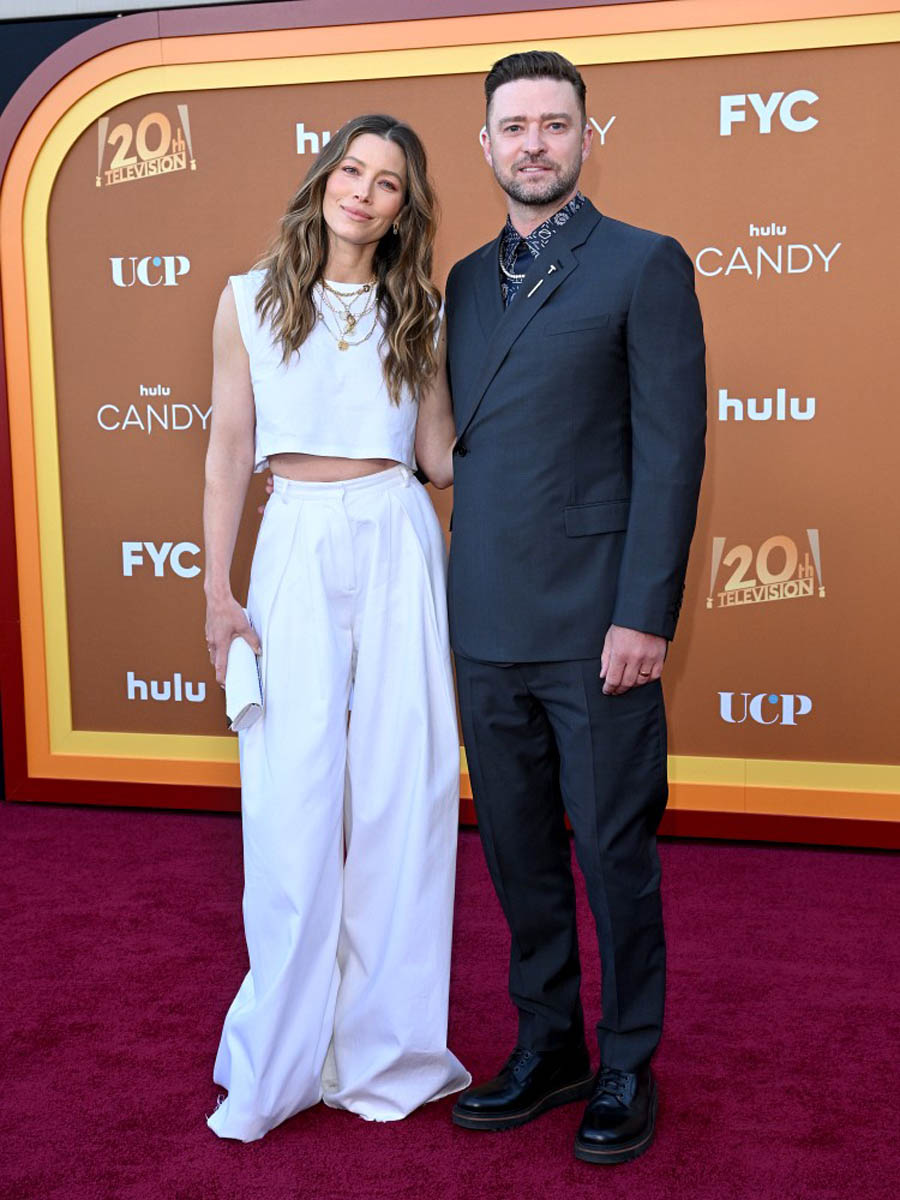 Jessica and Justin are now back in LA for the release of her new limited series Candy which premiered on Hulu yesterday. She’s been doing interviews to promote the show, including Jimmy Kimmel Live! last night and she and Justin also attended the premiere. I love this outfit on her – the oversized pants and the slightly cropped top accessorised by all those chains, it’s a fresh look. And, amazingly, he’s not obscuring it. By either jumping in front of her or behind her or spectacle-ising himself in any way. But since we’re talking about that, let me just bring back the classic: