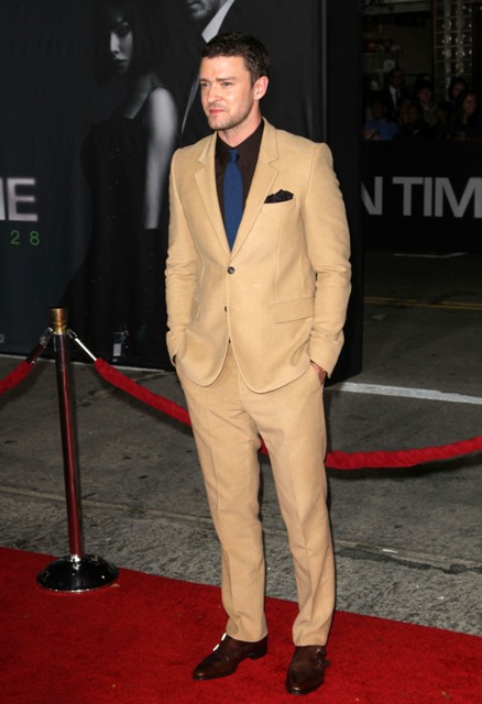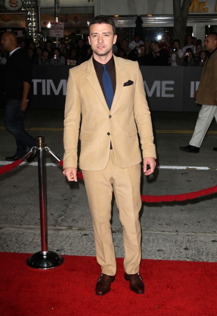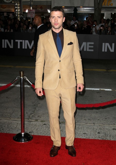 And here he is, in a camel coloured suit and a brown shirt underneath and a blue tie and it’s all supposed to be work because HE IS JUSTIN TIMBERLAKE. I dunno, son. I’m not sure Brad Pitt could make this work. But Brad Pitt wouldn’t try.