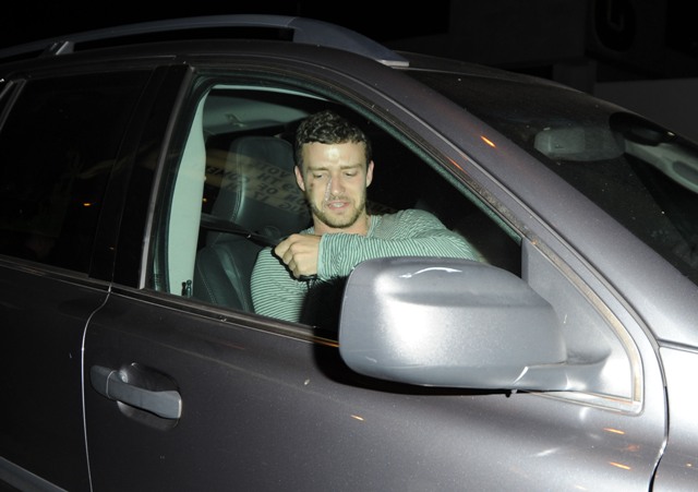 Here are Justin Timberlake and his Shelf Ass Jessica Biel leaving the Comedy Club last night. As you can see, he’s wearing his sh*t-eating grin and suspenders casually looped off his hips. Suspenders that were never pulled up over his shirt to begin with.